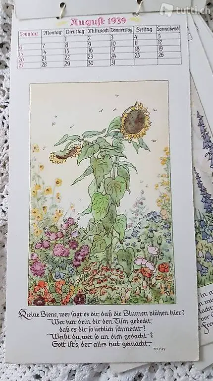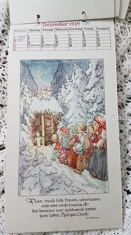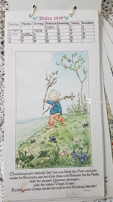 12 Stk einmalig schöne Kunstpostkarten mit Text, gezeichnet von Ruthild Busch-Schumann, zusammengefasst in einem Kalender aus dem Jahre 1939