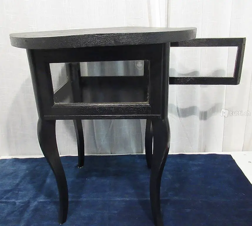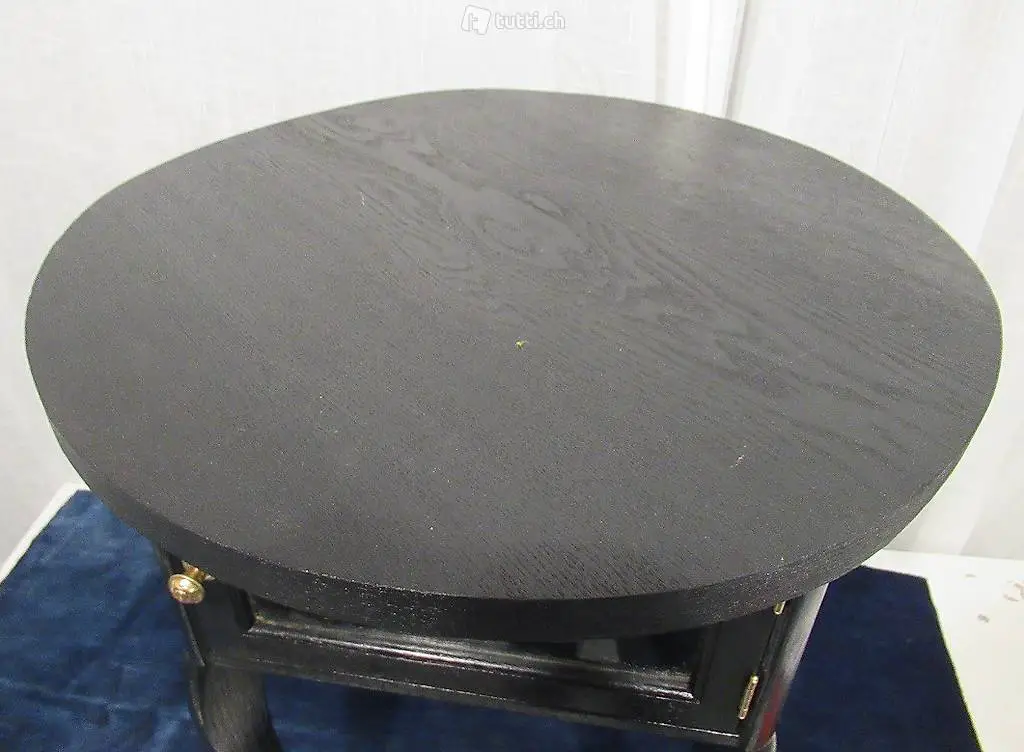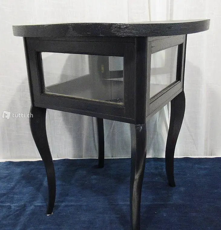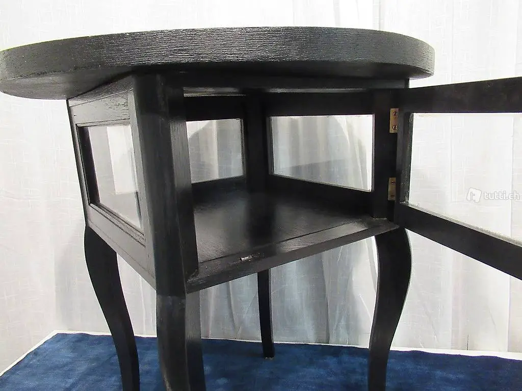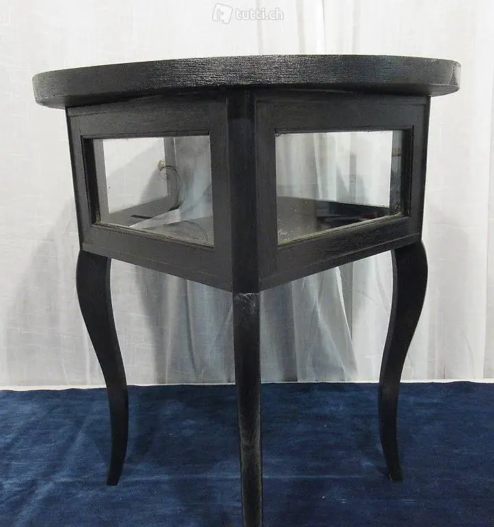 Schöner alter Tisch mit einen kleinen Vitrinen-Teil. Die Tischplatte ist ein wenig wellig. Wurde wieder etwas mit Farbe aufgefrischt. Durchmesser 60 cm und 68 cm hoch.