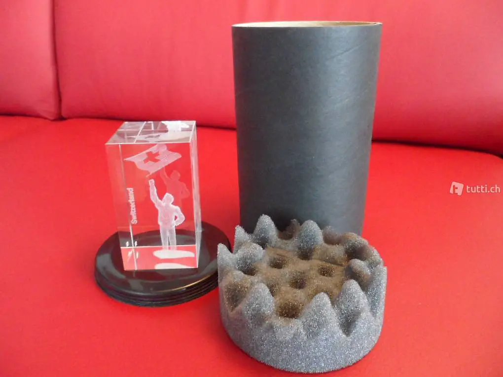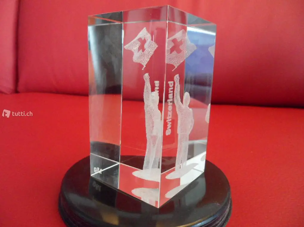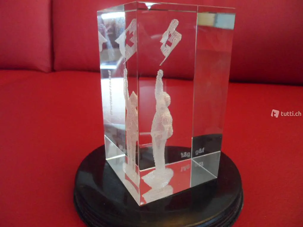 Biete diesen bei Kirchhofer AG in Interlaken gekauften Glasquader in der Grösse 50x50x90mm. Der Schweizer mit Fahne wurde mit Lasertechnik in 3D in das