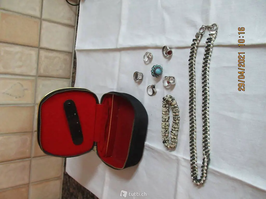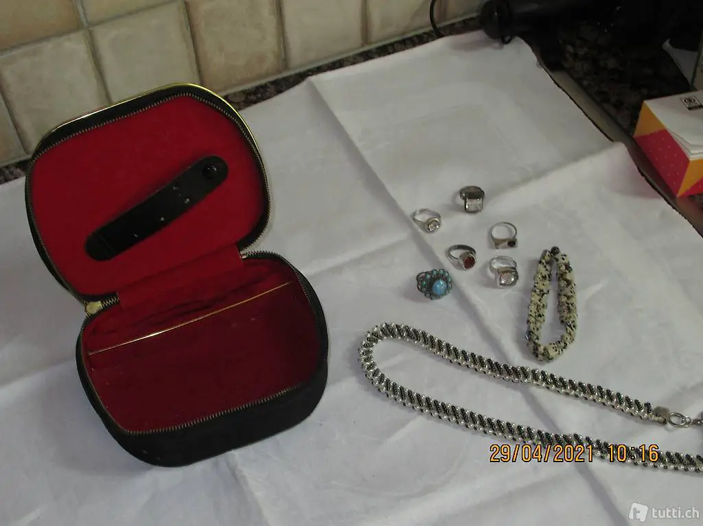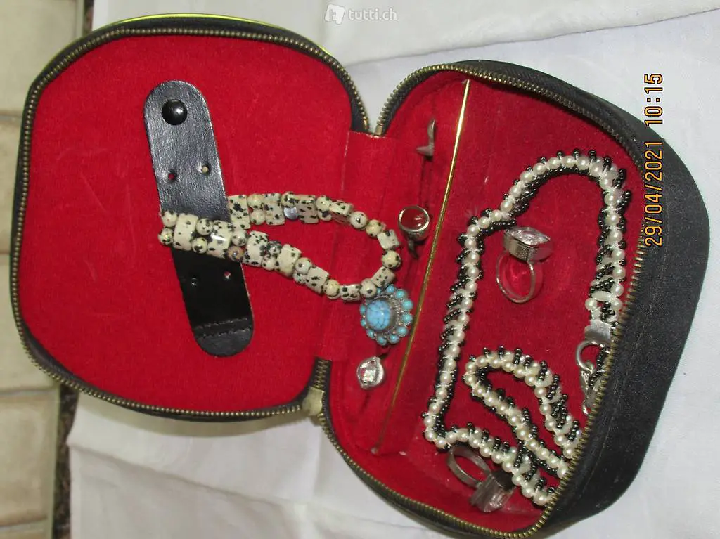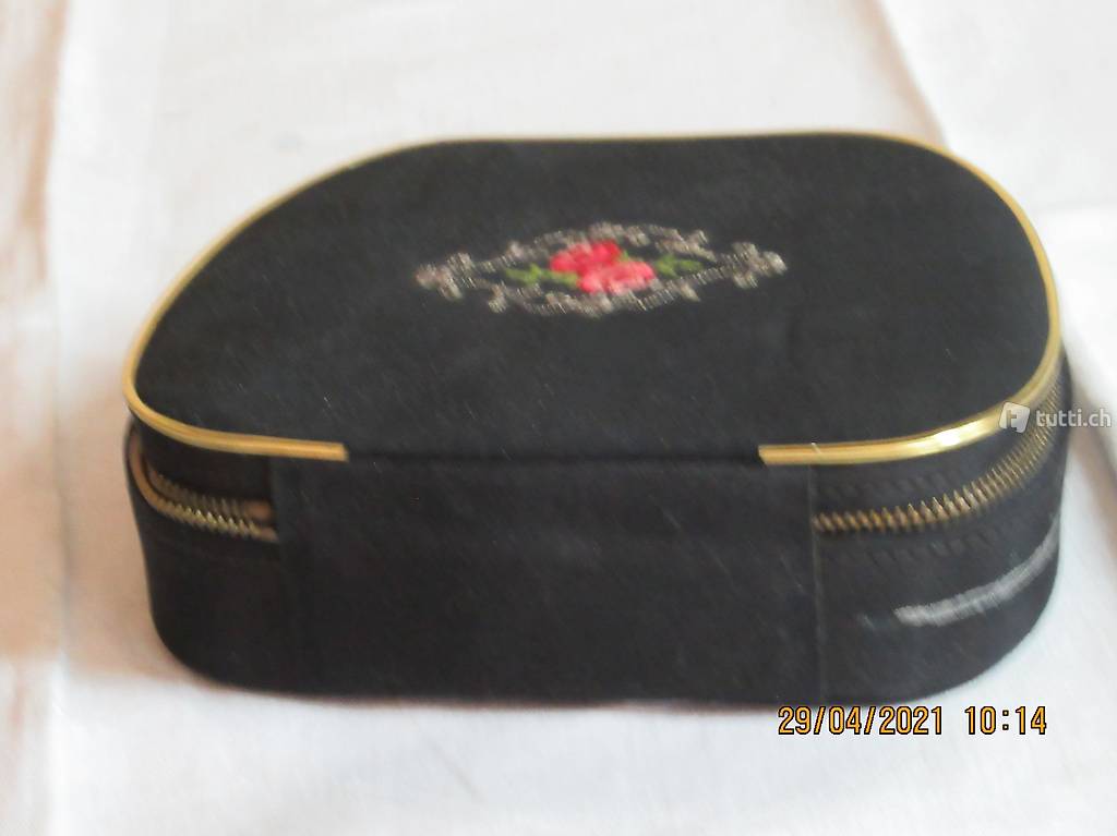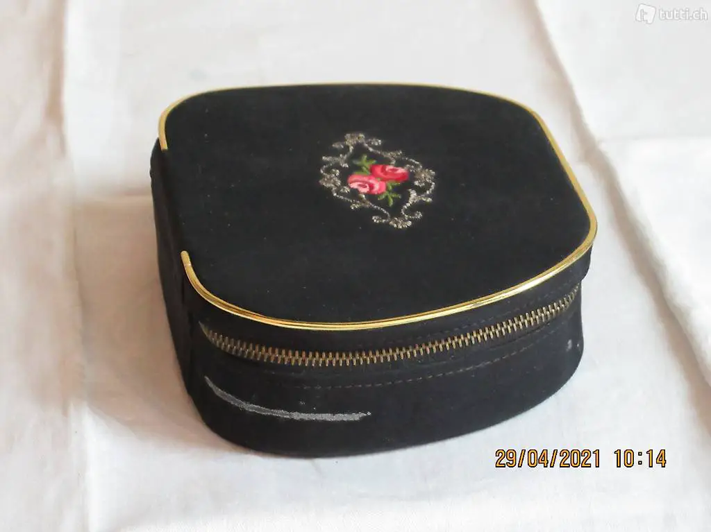 Seidenbox mit Reissverschluss zum Öffnen, Masse siehe Bilder Innenteil siehe Bilder, Innenteil Samt, verschiedene Fächer für Ringe . Ketten und Broschen ect.