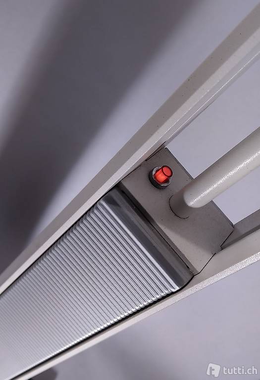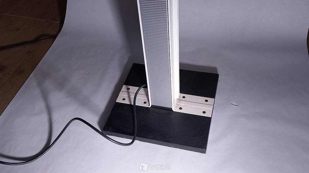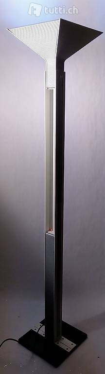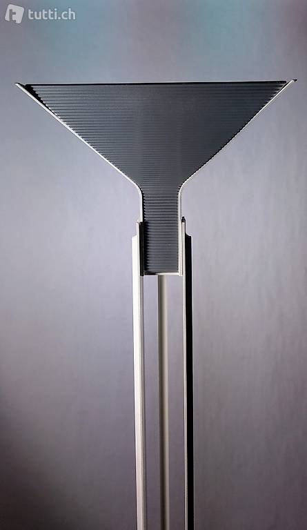 Stehleuchte, Deckenfluter postmodern ca 1980 im Stil von Mario Botta, breit ausladender, pyramidenförmiger Reflektor für 1 x Metalldampflampe (HgI-TS 250 Watt) und 1 x Halogen-Stablampe. Es funktioniert nur die Metalldampflampe!