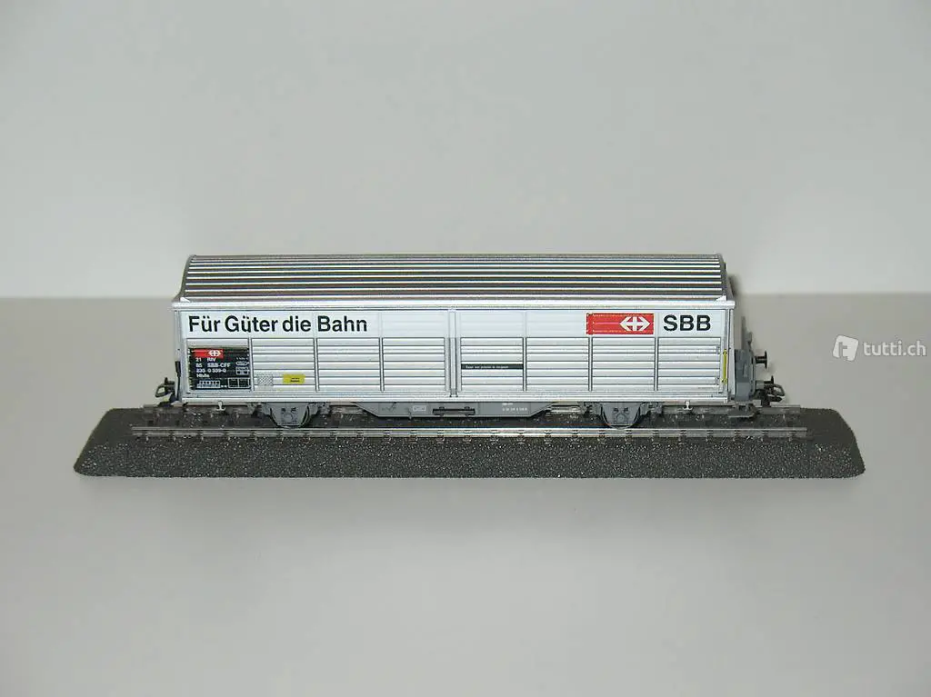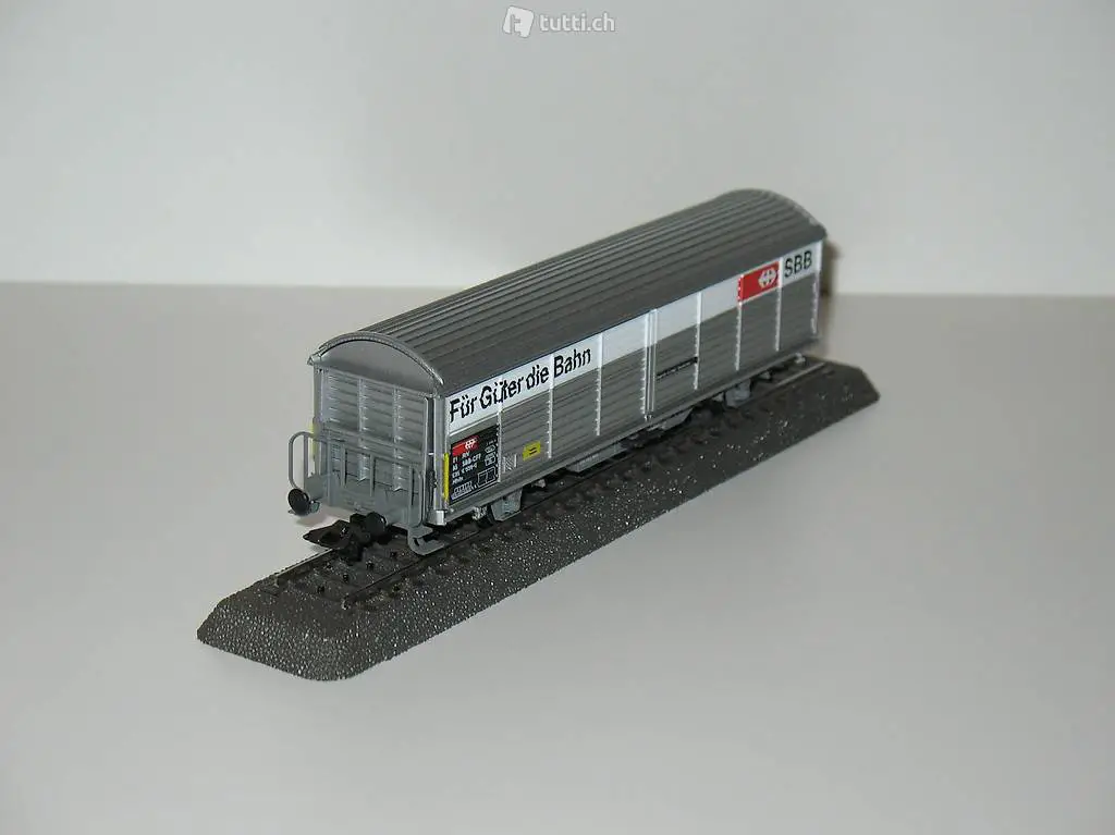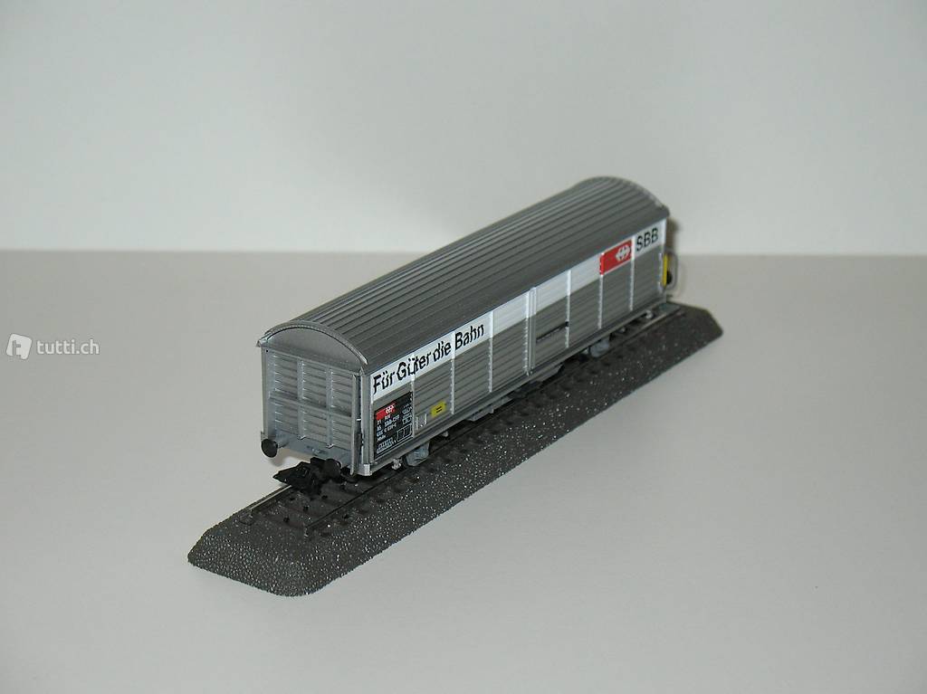 Märklin (Artikel Nr. 4834) . Der gedeckte Schiebewandwagen der SBB ist mit der Werbeaufschriften der SBB; Für Güter die Bahn beschriftet. Der Güterwagen ist wie neu in der OVP (siehe Bilder) . Der Güterwagen kann bei mir besichtigt / abgeholt werden oder bei Vorauszahlung mit der Post (plus 8.-Fr. Porto und Verpackung) verschickt werden. Beachten Sie auch die weiteren Angebote.