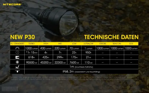 Mit der Nitecore NEW P30 erhält das nächste Modell der Precise Serie ihr Update.Die CREE XP-L HI V3 erreicht maximal 1000 Lumen und eine Leuchtweite von über 600 Metern. Die kompakte Grösse macht die NEW P30 zu einem alltagstauglichen Thrower. Im Gegensatz zum Vorgängermodell wird die NEW P30 mit einem 21700er Li-Ion Akku mit 5000mAh betrieben, dieser Akku gehört zum Lieferumfang. Der im Akku integrierte USB-C-Ladeanschluss komplettiert dies Produkt. Alternativ kann die Nitecore NEW P30 mittel mitgelieferten Adapter auch mit 18650 Li-Ion Akku oder 2 x CR123A Lithium Batterien betrieben werden.