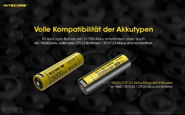 Batterien: 1 x 21700 Li-Ion Akku oder 2 x CR123A Lithium Batterien oder 1 x 18650 Li-Ion Akku oder 2 x RCR123 Li-Ion Akkus
