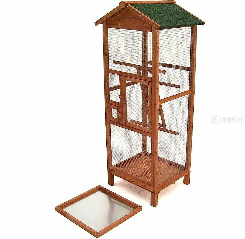 Die grosszügige Vogelvoliere besteht aus ausgewähltem Holz mit einer wasserfesten braunen Lasierung. Das stabile Dach ist mit