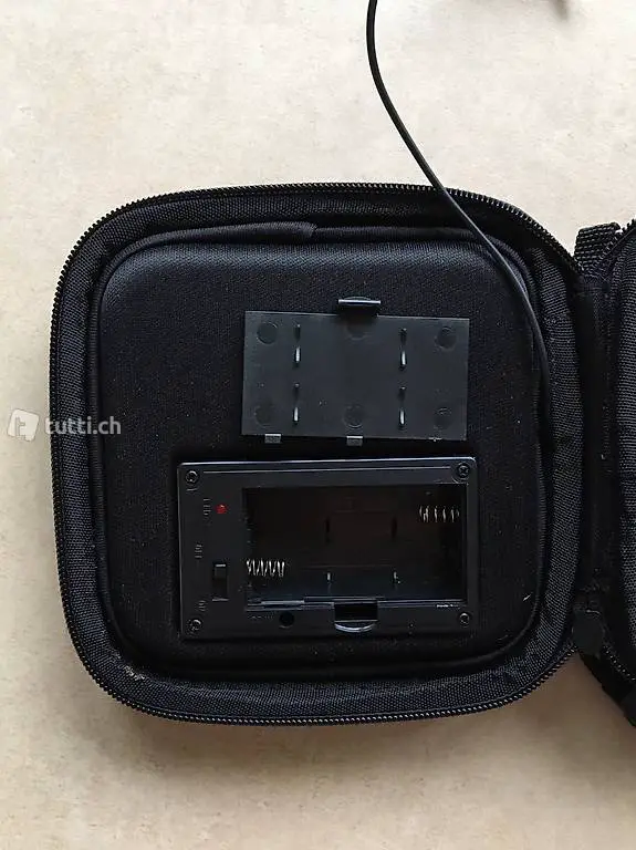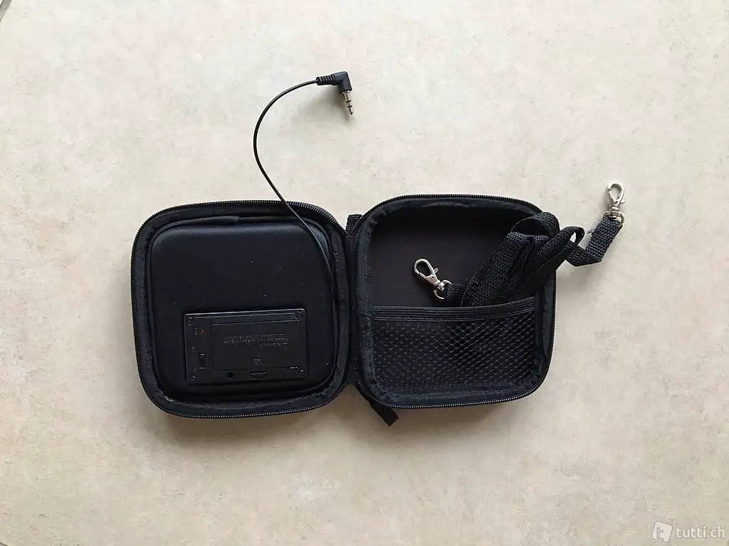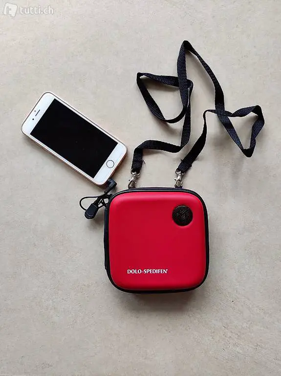 Cassa audio portatile con custodia e tracolla, collegabile tramite jack 3.5 mm a cellulari / iPhone / lettori MP3 etc., due livelli di volume, alimentazione con due stilo tipo AA.