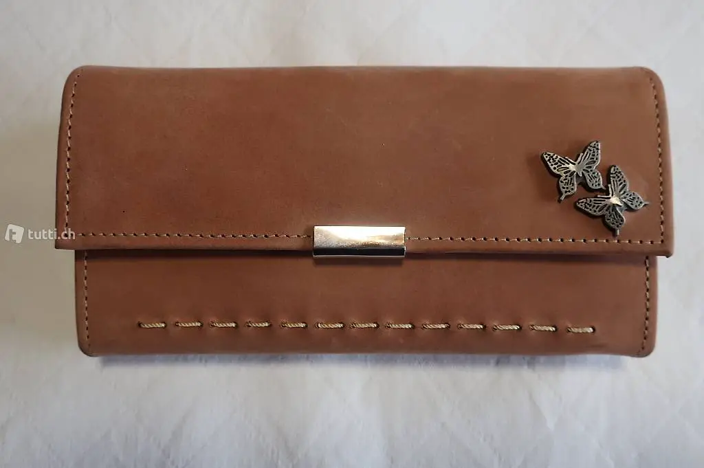 Portemonnaie Braun Naturleder mit Magnetverschluss un 2 Schmetterlingen.