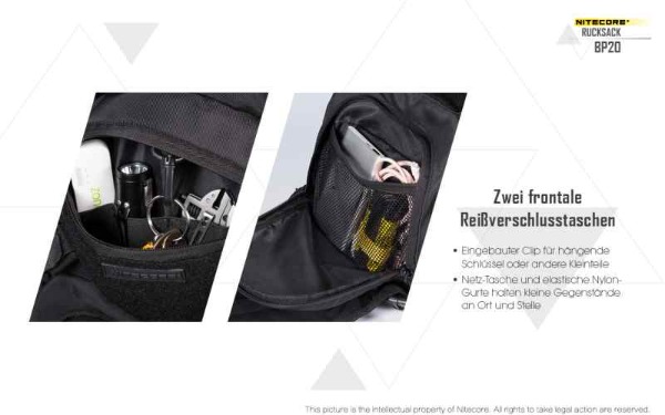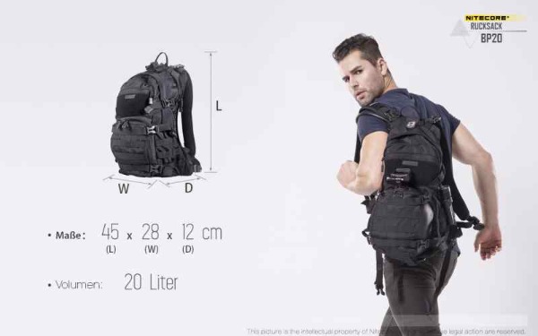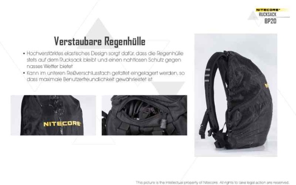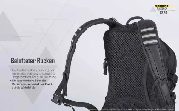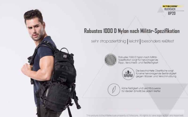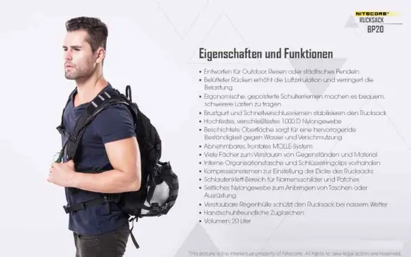 Tagesrucksack mit 20 Liter Fassungsvermögen. Der Nitecore BP20 überzeugt durch sein durchdachtes Design - sehr gute Hinterlüftung, mehrere Molle Elemente für die Befestigung zusätzlicher Ausrüstung oder Kleintaschen, Regenüberzug, Klettelemente, Helmtasche, ...