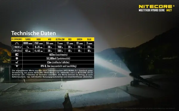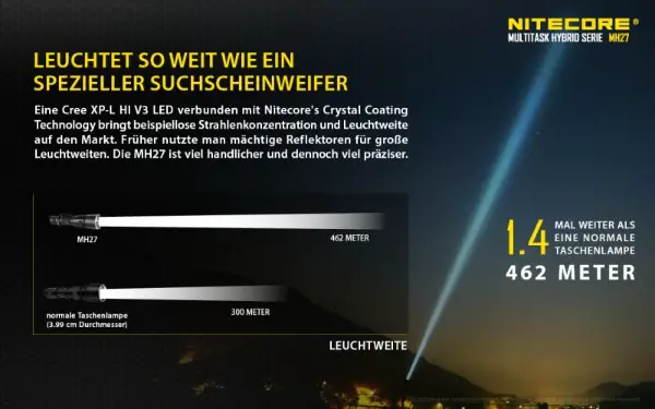 Die CREE XP-L-HI V3 LED leistet 1000 Lumen, die MH27 erreicht damit eine Leuchtweite von 462 Meter. Das integrierte