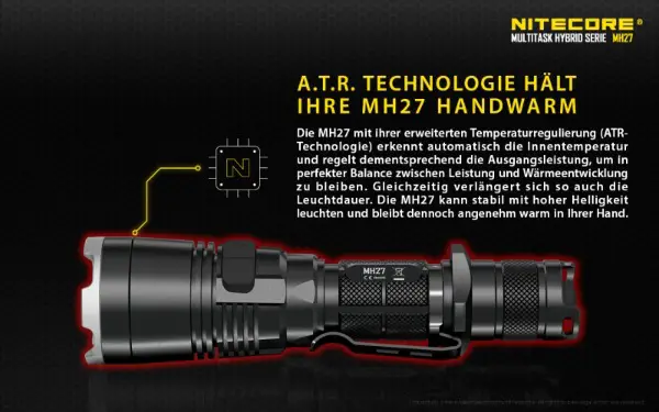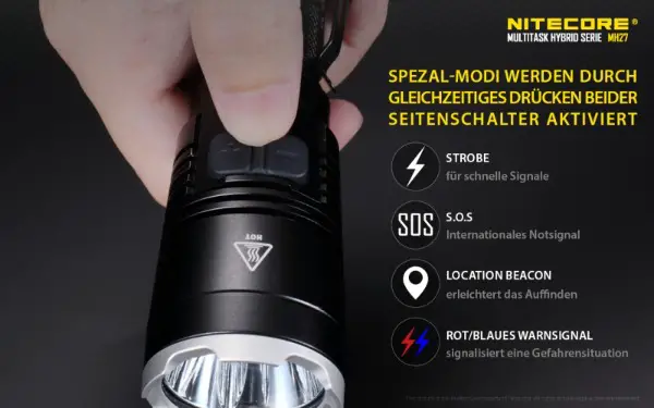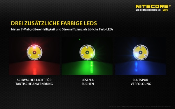 Ladegerät und die drei farbeigen LED´s (rot, grün, blau) , machen die NITECORE MH27 nicht nur für Jäger zu einer besonders interessanten