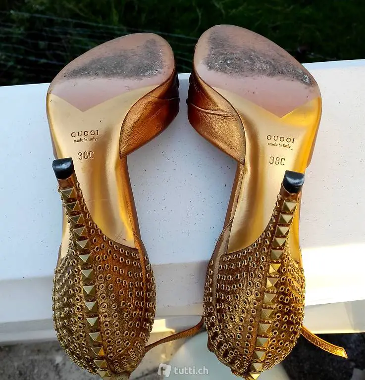 Leder gefertigt und sind mit goldfarbenen Rund- und Spike-Nietenverzierungen an der Fersenrückseite sowie am Absatz in der Mitte ausgestattet. Diese Pumps verfügen ausserdem über eine runde