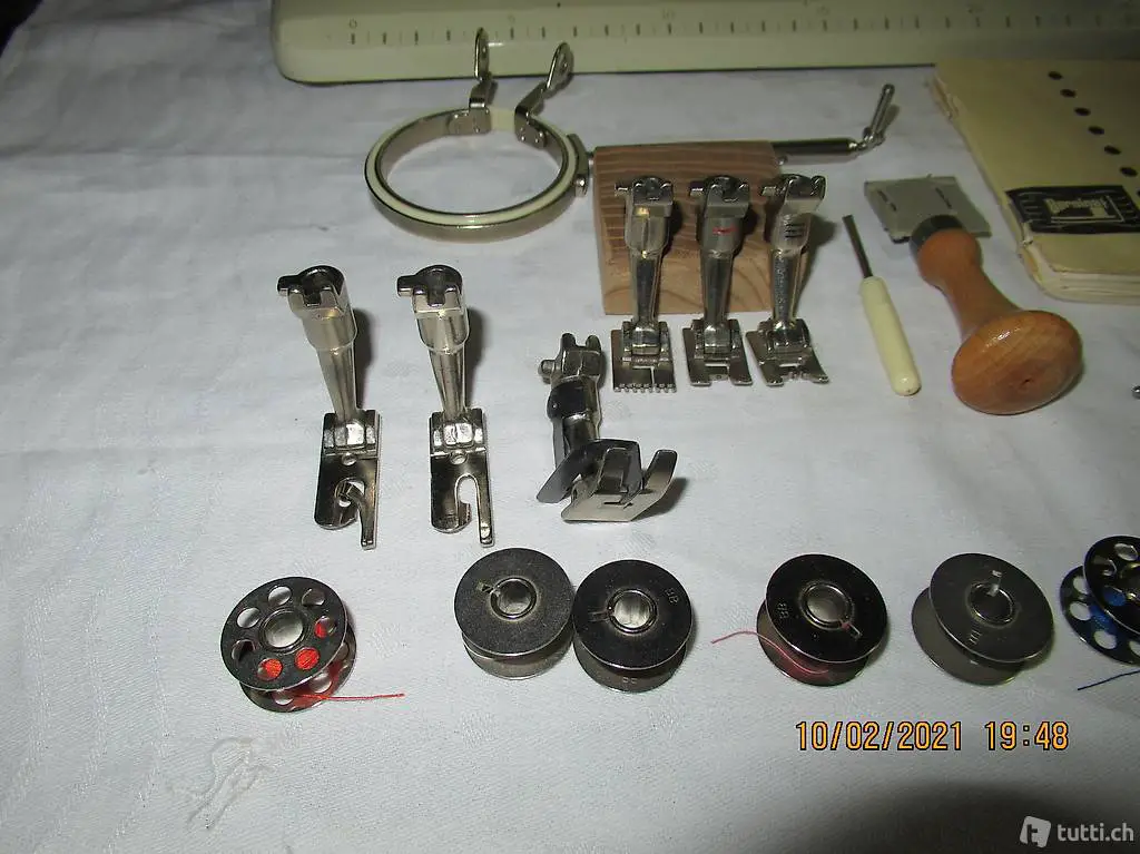 Gebrauchsanleitung und Anschiebetisch, die Maschine kann Probegenäht werden, näht gerade zickzack, Wiefelt, Stopft, näht Knöpfe an, macht Knopflöcher, ideal auch für Saum, näht auch dicke Stoffe und Lederund vieles mehr