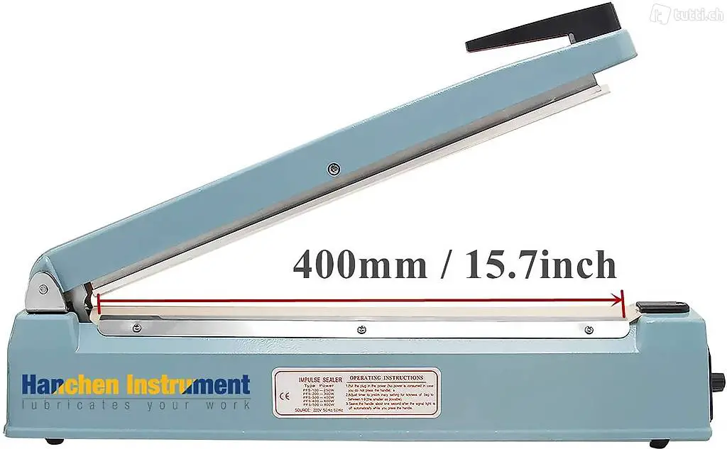 Dichtungslänge: 400 mm. Dichtbreite: 2 mm. Leistung: 600 W. Der Beutelschweissgerät wird verwendet, um Produkte wie medizinische Taschen, Lebensmittel- und Getränkeprodukte,