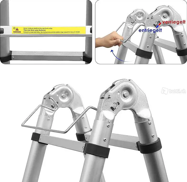 Denken Sie daran: Sicherheit zuerst. Bitte verwenden Sie es unter der Voraussetzung, dass die Leiter stabil ist. Bitte ziehen Sie jeden Abschnitt der Aluminiumleiter in die Schnallenposition und lassen Sie die Schnalle vor dem Gebrauch vollständig in ihre feste Position einrasten.