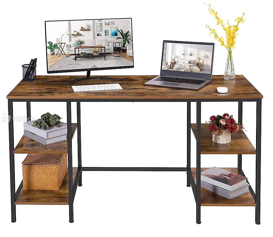 Tischplatte ist gross genug für zwei Computermonitore, und die vier offenen Ablageflächen bieten Ihnen genügend Platz für Dinge, die Sie leicht zugänglich aufbewahren können