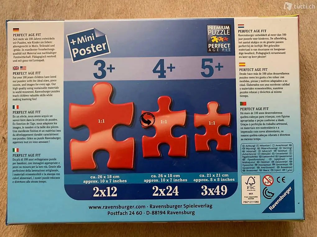 Puzzleteile immer wieder zu ihren Lieblingsmotiven zusammen zu setzen. Doch Puzzles bieten mehr als Spass: Mit der richtigen Schwierigkeit gewählt, lassen sie Kinder jeden Alters an den Herausforderungen wachsen, erhöhen ihre Geduld und stärken ihr Selbstvertrauen. In der grossen Auswahl von Ravensburger von weit mehr als 300 Kinderpuzzles mit den beliebtesten Motiven, von 2 Teilen bis 500 Teilen, ist garantiert für jedes Kind das richtige Puzzle dabei. Nur so schulen sie spielerisch und mit Freude ihre motorischen Fähigkeiten, ihr logisches Denken, das Kurzzeitgedächtnis und vieles mehr. Die Auswahl der richtigen Motive und die hohe Qualität unserer Kinderpuzzles liegen uns sehr am Herzen. Deshalb wird die Unbedenklichkeit aller Materialien von einem unabhängigen Institut bestätigt. Vertrauen Sie in die Qualität und Erfahrung des Marktführers, denn seit mehr als 100 Jahren entwickeln wir Puzzles, wie Kinder sie lieben: altersgerecht in Motiv, Teilezahl und -grösse.?