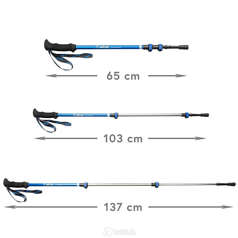 Besonders klein: Die Trekking Stöcke haben eine Länge von nur 65 cm und lassen sich kinderleicht auseinanderziehen. Dann haben sie eine Länge von ca. 103 cm und lassen sich bis auf ca. 137 cm ausziehen.