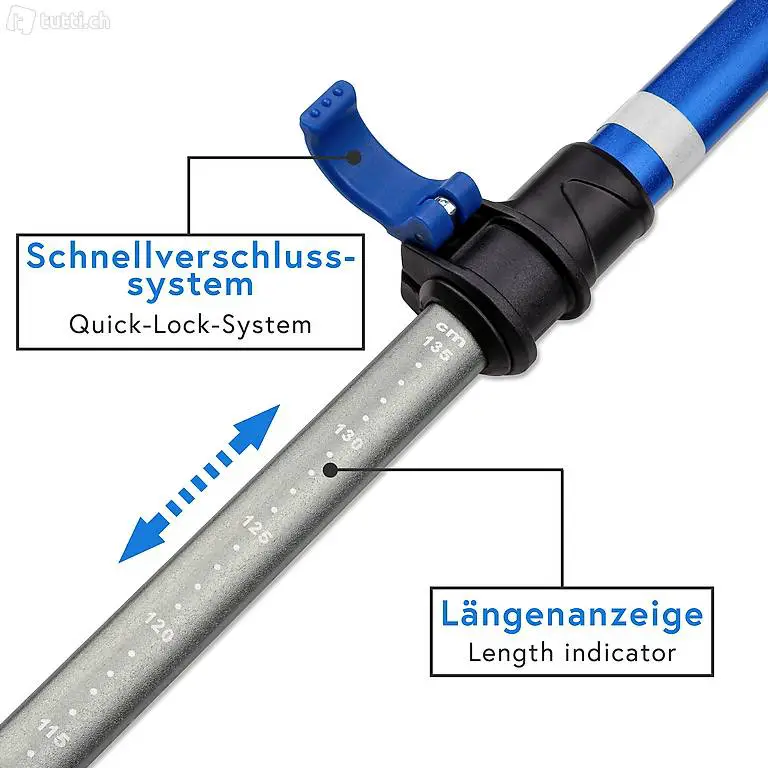 Produkteigenschaften: Der Trekking Stock ist aus robustem Aluminium mit einem Gewicht von ca. 260 g pro Stock. Er zeichnet sich durch ein optimales Verhältnis zwischen Leichtigkeit und Stabilität aus.