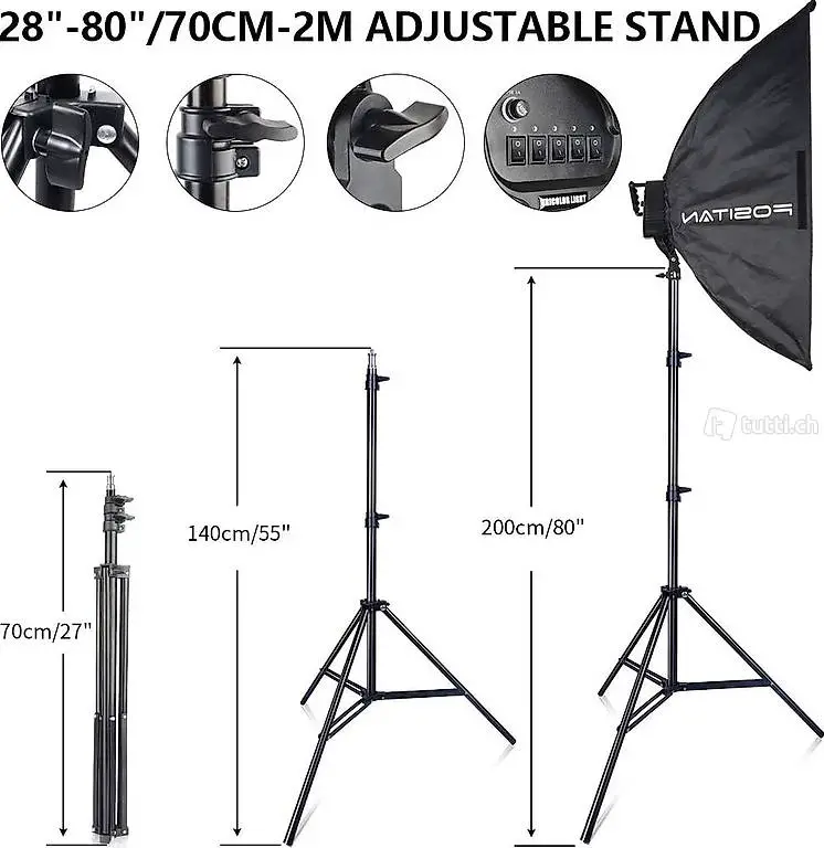 Höhenverstellbarer Lichtständer und drehbarer Kopf - Die Höhe des Lichtständers kann im Bereich von 28 " - 79 " eingestellt werden. Die Softbox kann nach der Montage an der Halterung in mehreren Winkeln gedreht werden. Es kann in mehreren Winkeln beleuchtet werden, ohne den Lichtstativ zu bewegen, was flexibel und bequem ist.