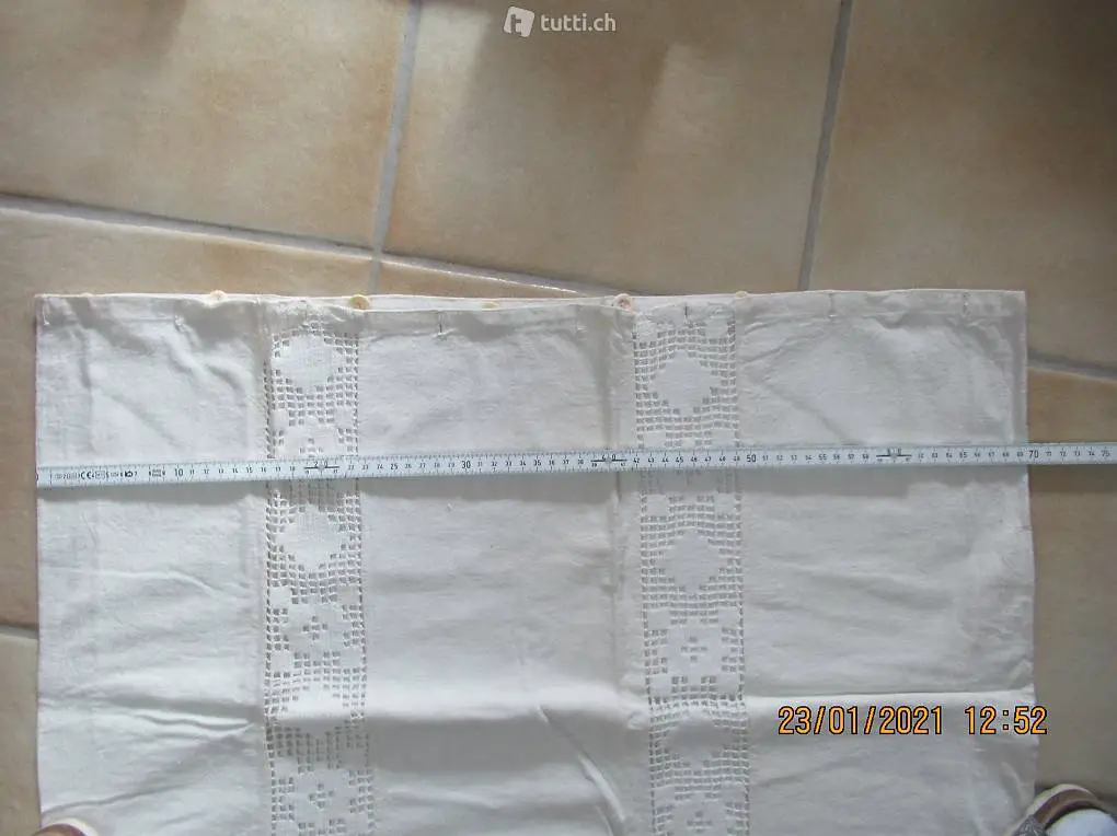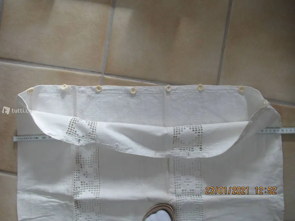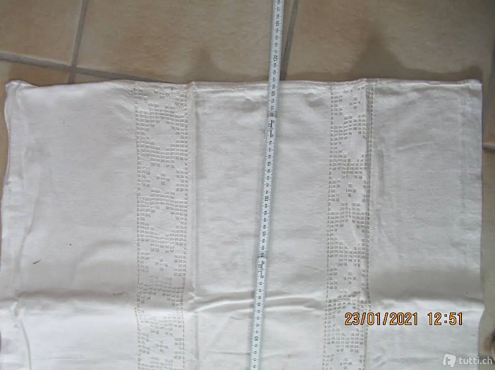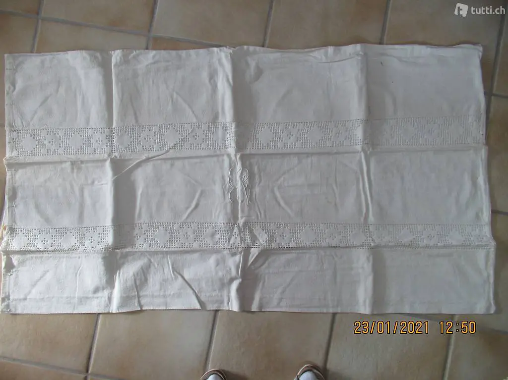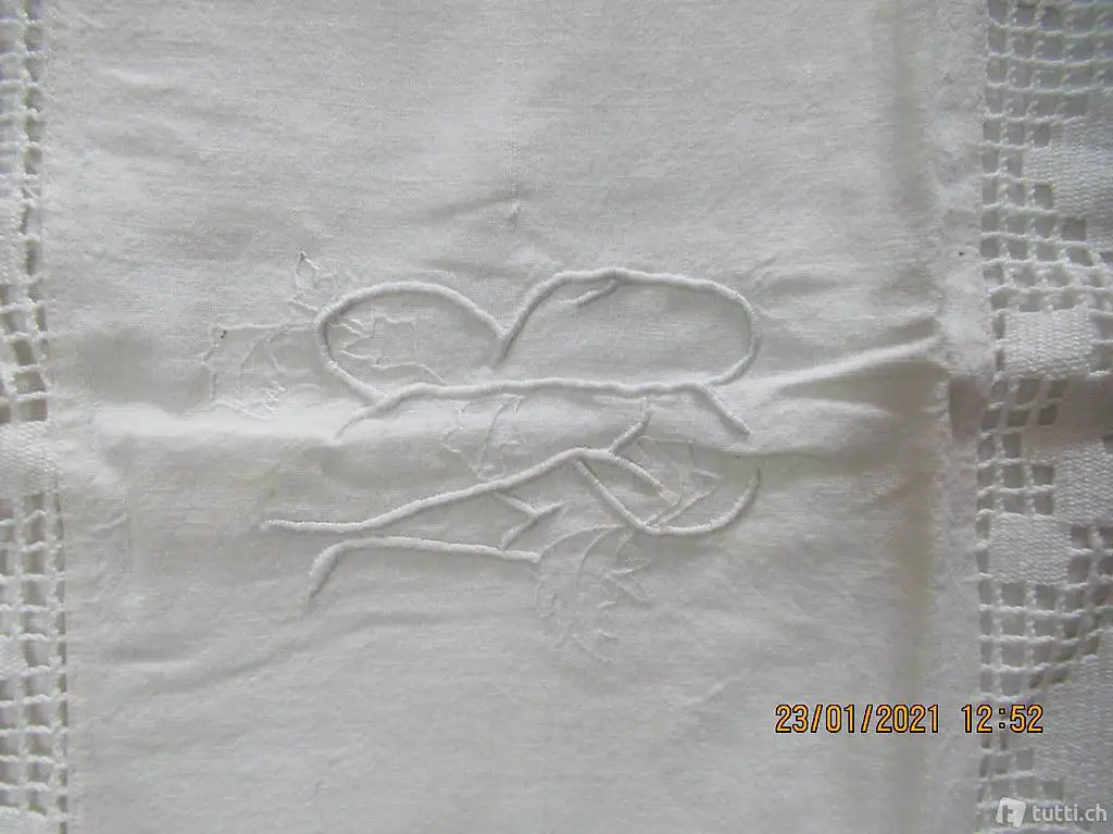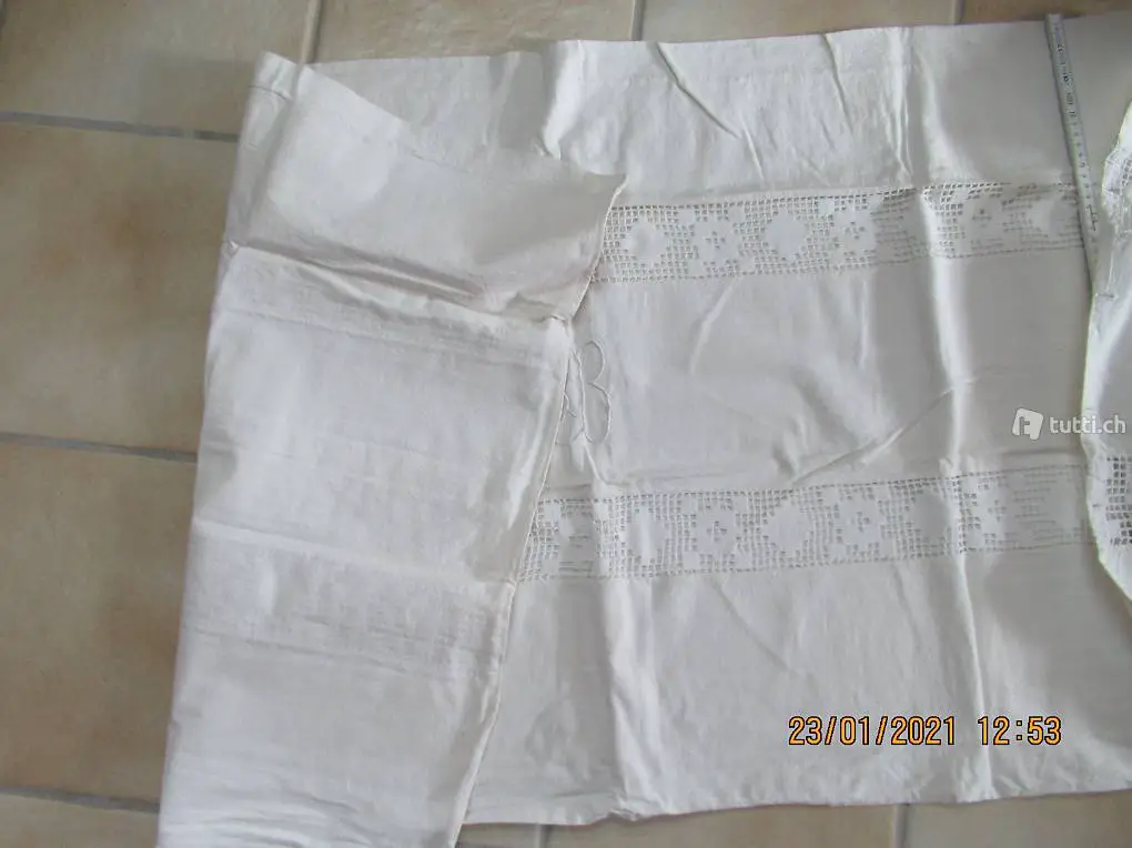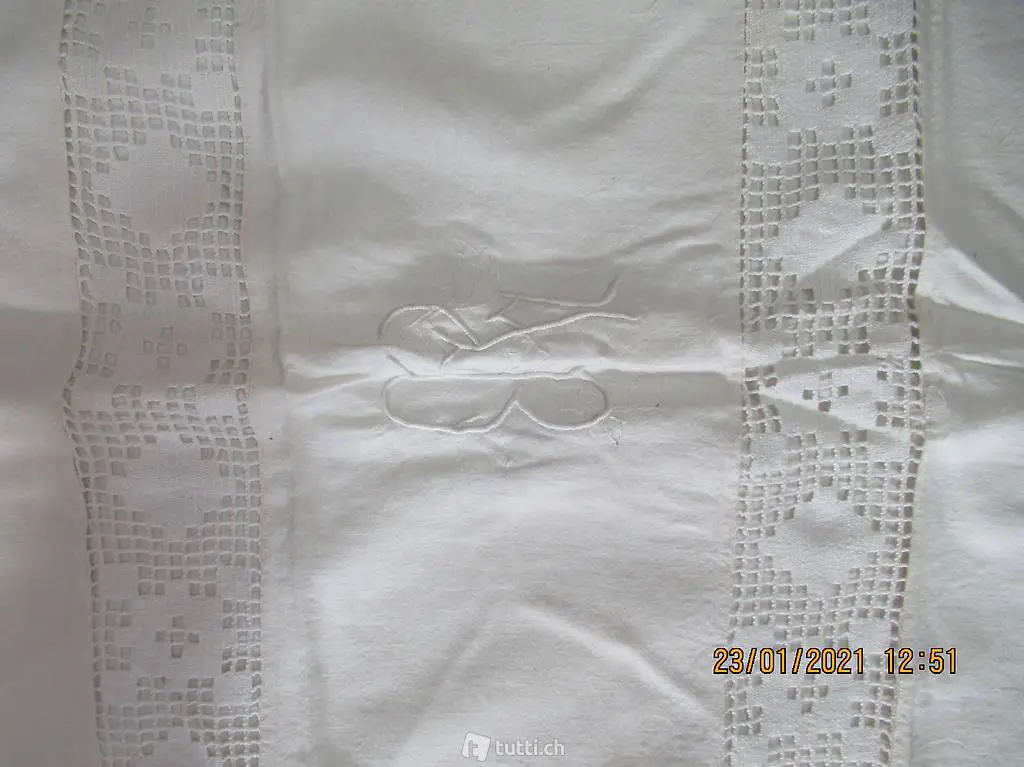 Kinderbett? vermute 100% Leinen, mit schöner Handarbeitseinlage und Monogramm, Duvet Bezug, Düvetüberzug, Kissenüberzug, Masse 127/70, Einseitig mit Knopfverschluss, alles feine Handarbeit, die Spitzen können auch abgetrennt werden, ein Stück wie zu Gotthelfs Zeiten