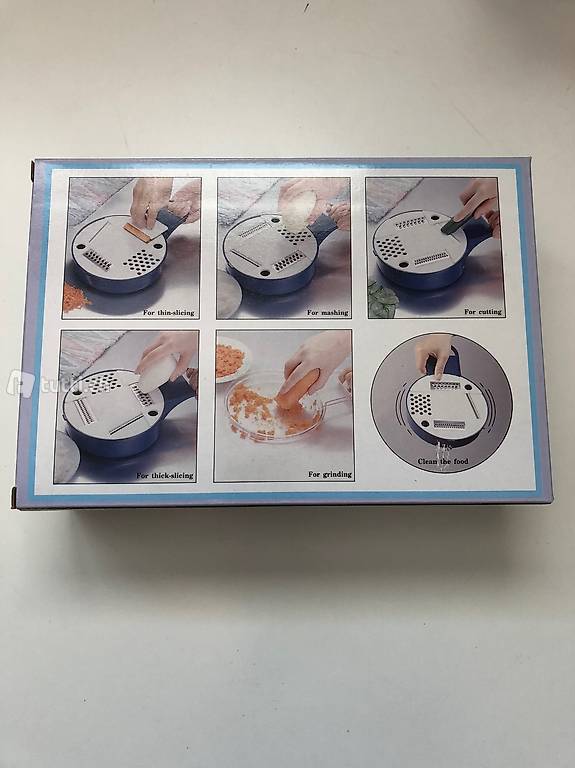 Kunststoff. Auch in blau zu haben. Klingen aus Edelstahl. Durchmesser Behälter ca. 18 cm, Länge mit Stiel 27 cm, Höhe Behälter 5 cm. Mit praktischem Halter für das zu verarbeitende
