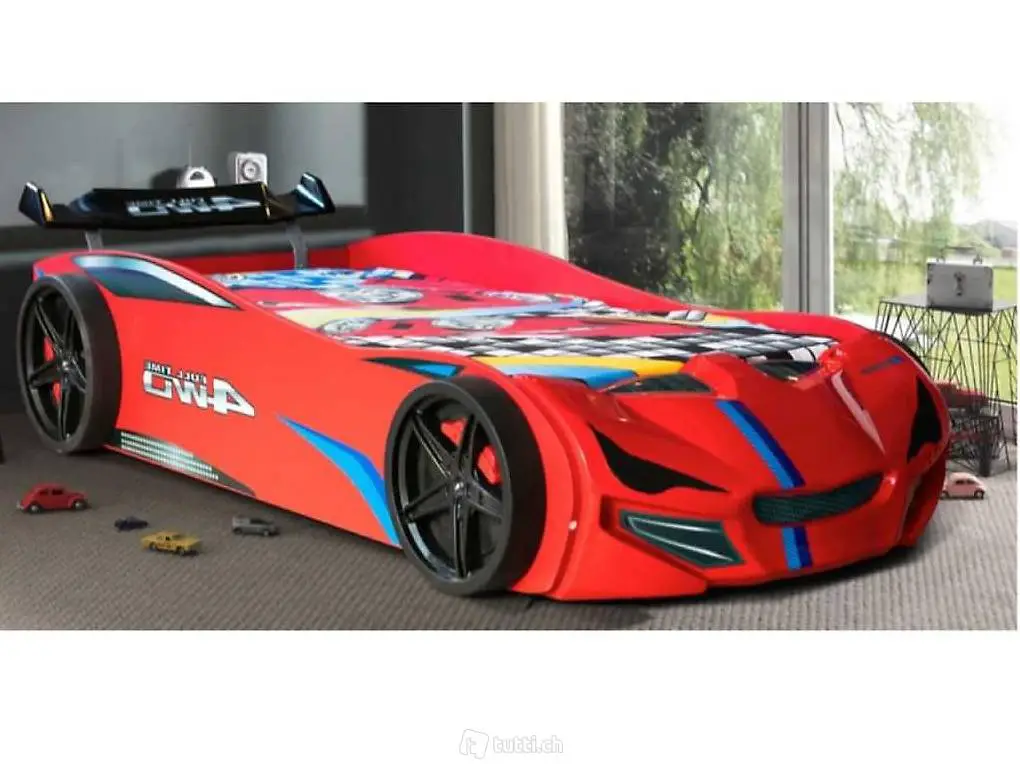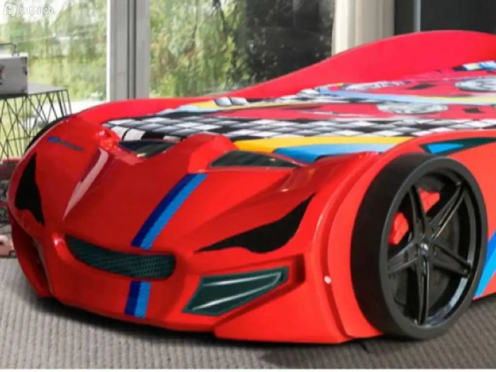 Rennwagen nachempfunden ist, spricht jeden jungen Rennfahrer an. Die Seiten sind aus dem 18 mm starken Holzwerkstoff Spanplatte und mit Motiven bedruckt. Die Räder, die Front und der Heckspoiler sind aus Kunststoff. Die breiten Reifen mit der Felgenoptik sind feststehend. Die Einlegetiefe für die Matratze ist ca. 45 cm. Die Bodenfreiheit ist ca. 4 cm. Der Artikel ist zerlegt mit Aufbauanleitung, zur einfachen Selbstmontage. Die