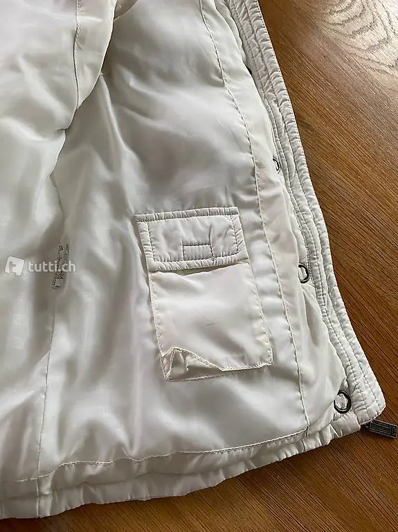 , mit Reiss- und Knopfverschluss. Gänsedaunen und Federnfüllung, plus ein Strickstehkragen.