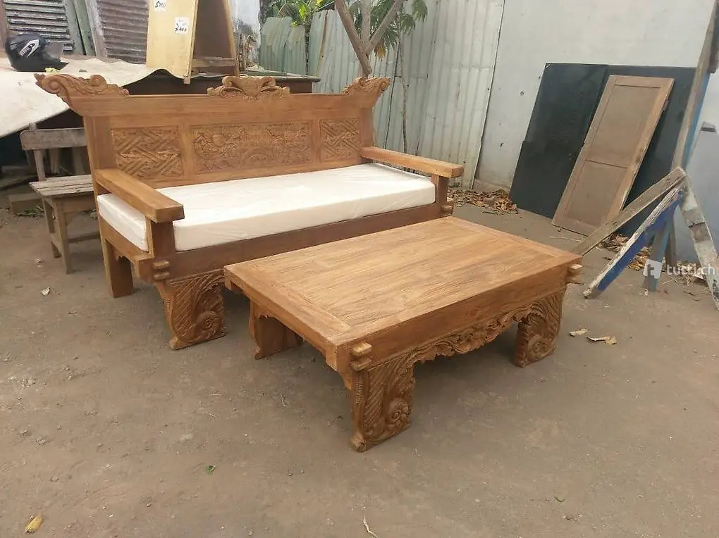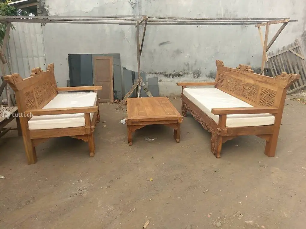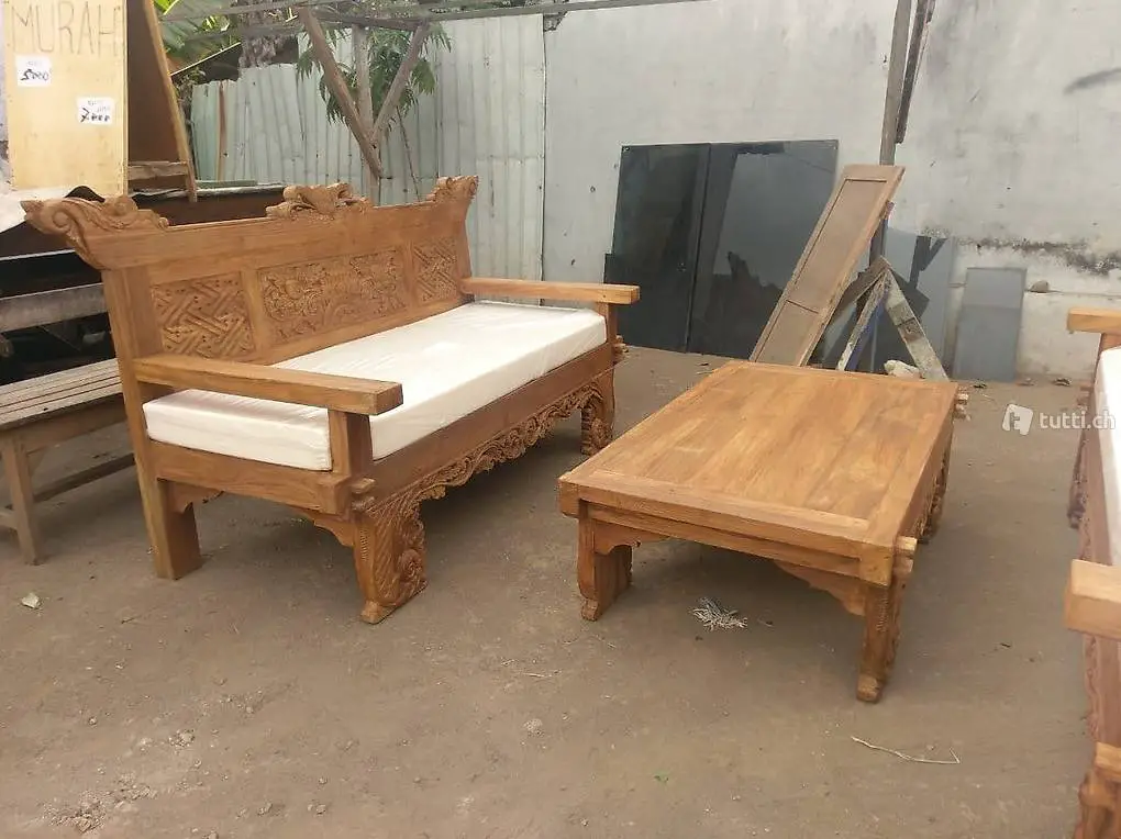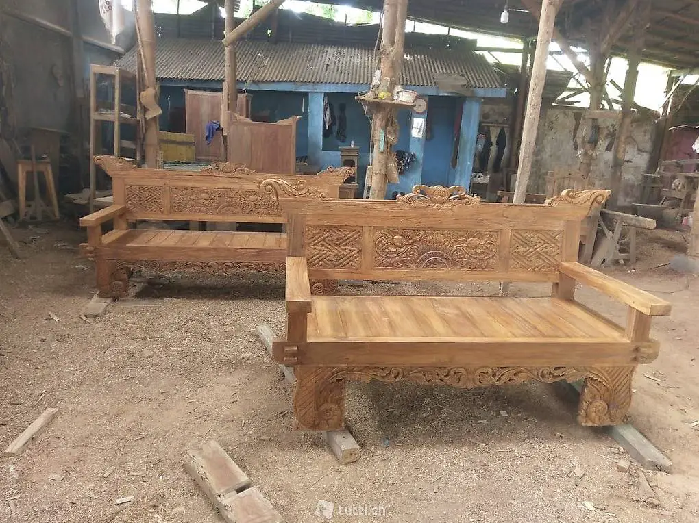 wird aus Teak Holz von Hand gefertigt, die Bank wird zerlegbar geliefert.