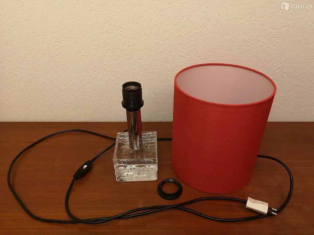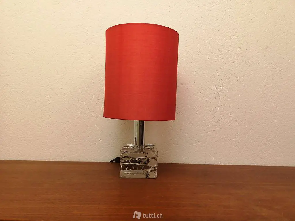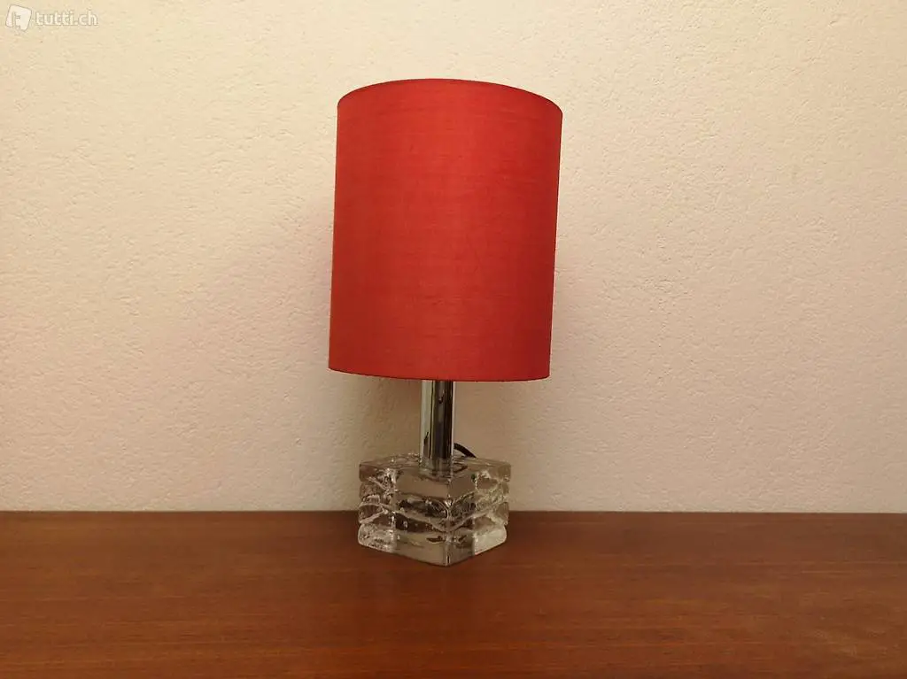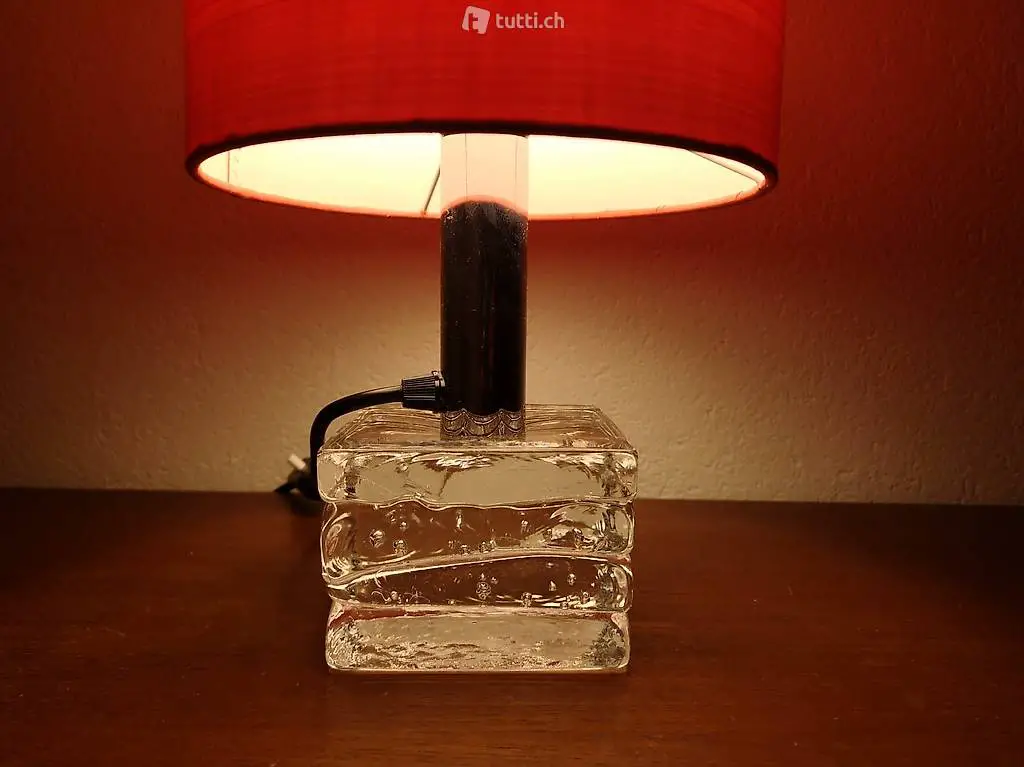Glas und einem roten zylinderförmigen Seidenschirm. Der schwere Glasfuss ist leicht gewellt und hat ein schönes Einschlussmuster aus Luftbläschen. Die