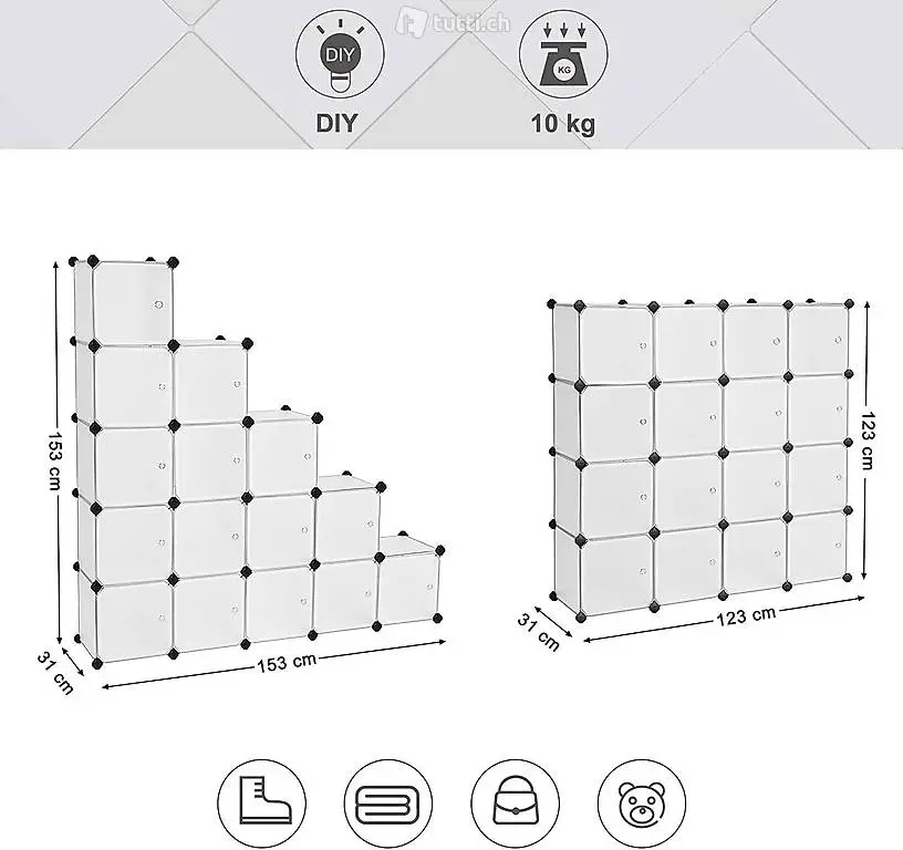 ZAHLREICHE VERWENDUNGSMÖGLICHKEITEN: Dieses Steckregal ist das perfekte Accessoire für Ihre Wohnung. Genau richtig, um Kleidung, Schuhe, Taschen und Spielzeug zu verstauen. Verwenden Sie es auch als Raumteiler oder kreieren Sie einen DIY-Laufstall für Ihr Haustier