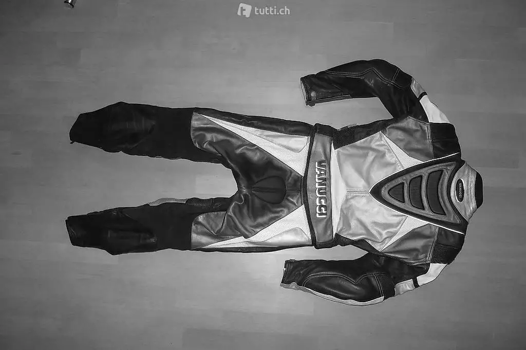 Hochwertige Details wie Carbonschützer an den Schultern, Rückenprotektor aussen und innen, teilweise perforiertes Leder, Pads für Knieschleifer,