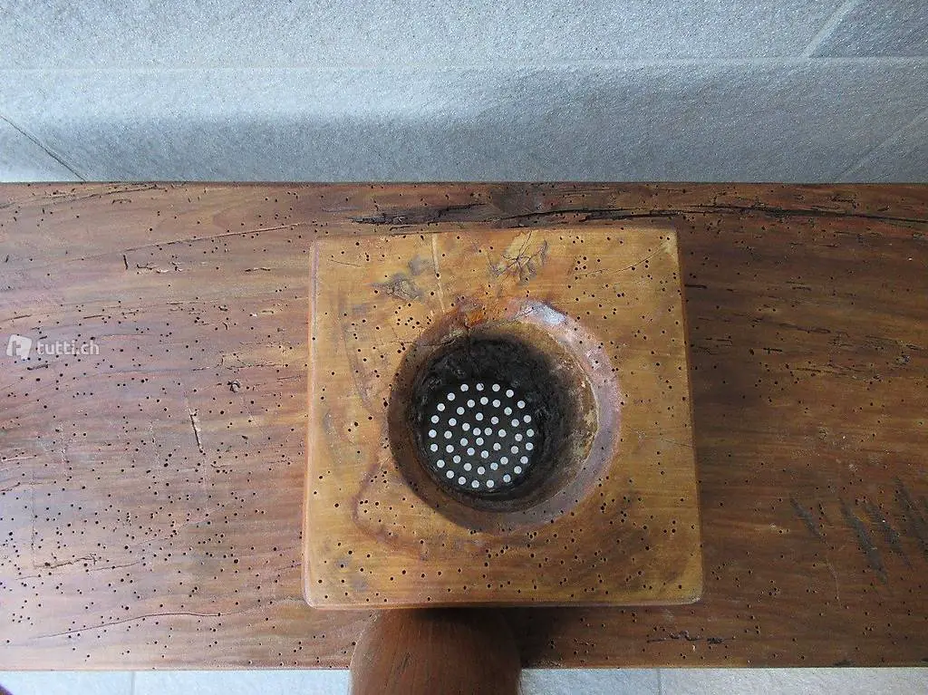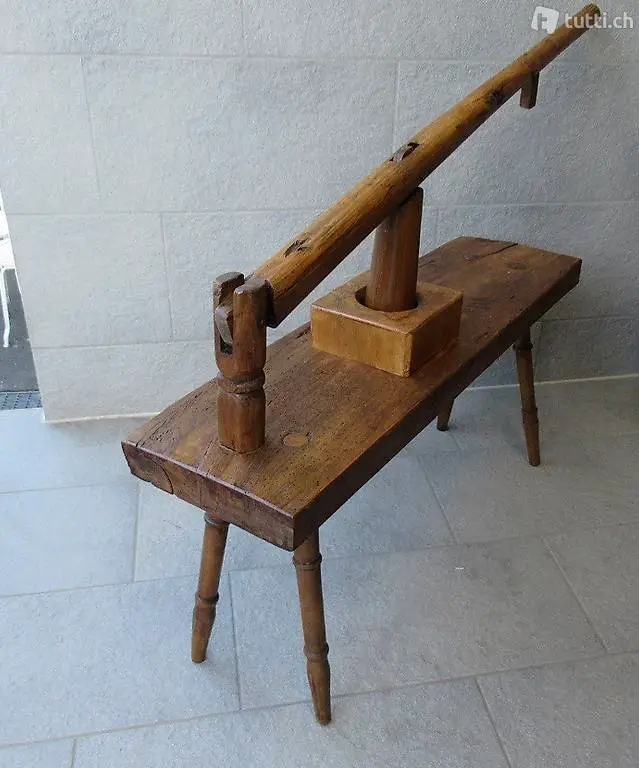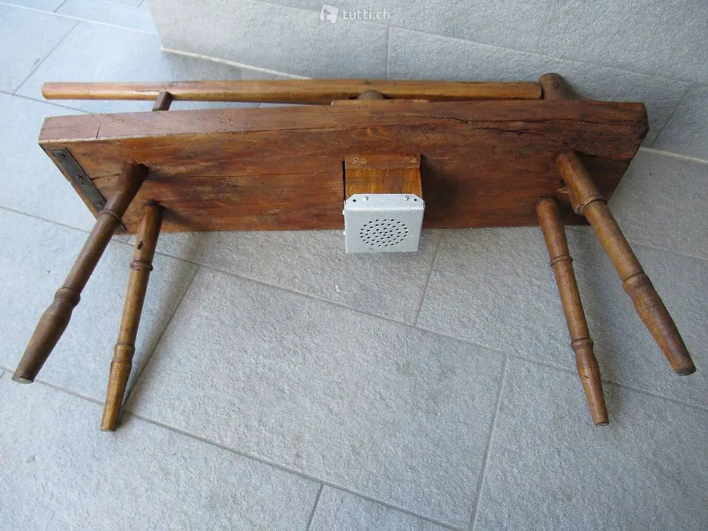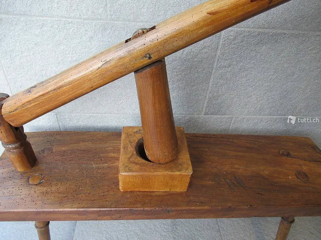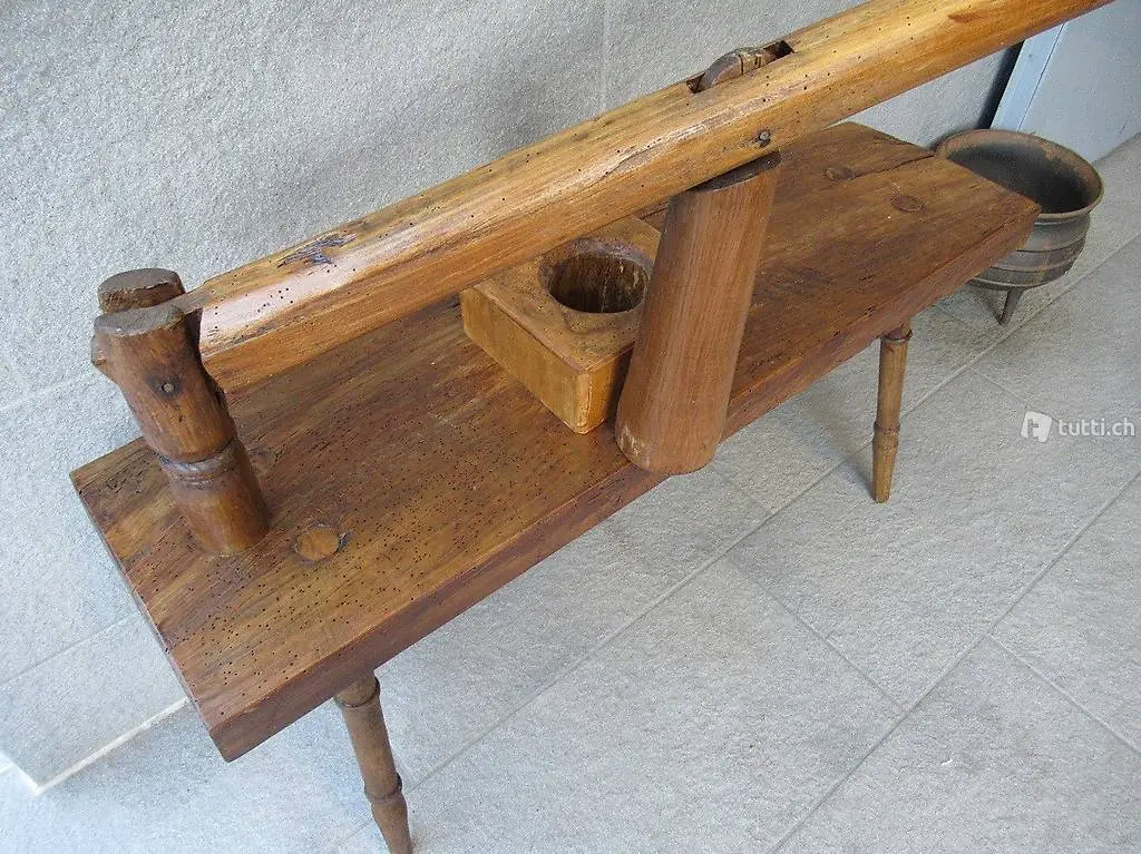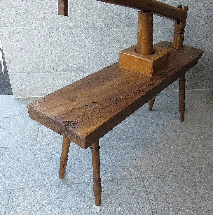 Schöne alte Ziger Käsepresse auf einer alten Stabellenbank. Laut ehemaligen Besitzer wurde damit für Ziger gepresst. Also die Flüssigkeit aus dem Frischkäse. Die Bank wurde wetterfest gemacht. Kann so auch mal im Regen stehen. Masse der Bank: 99 x 28 x 45 cm ohne Aufbau. Besichtigung und Abholung bei Flums Antik oder