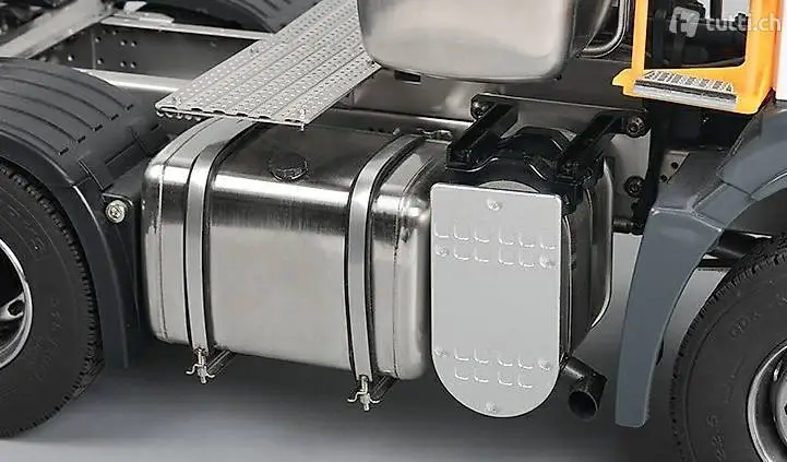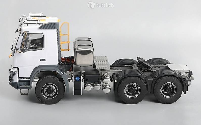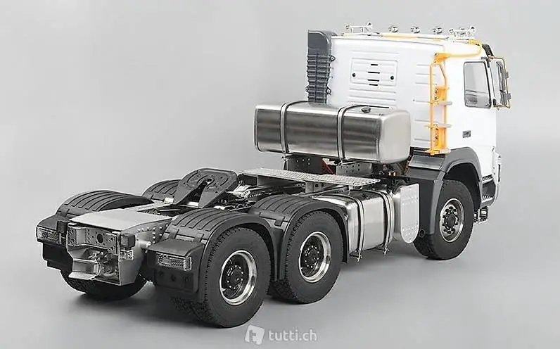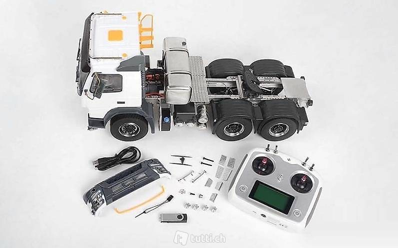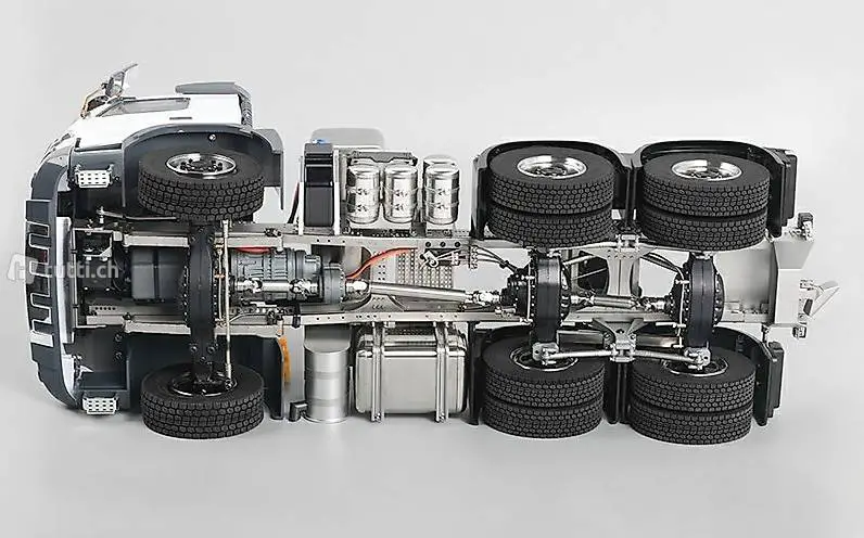 Massstab 1:14 verfügt über einen 6x6 Antrieb. Der Antriebsstrang ist komplett aus Stahl und endet in Voll-Aluminium Achsgehäusen. Schon das Leergewicht von 8kg spricht für eine robuste Bauweise.
