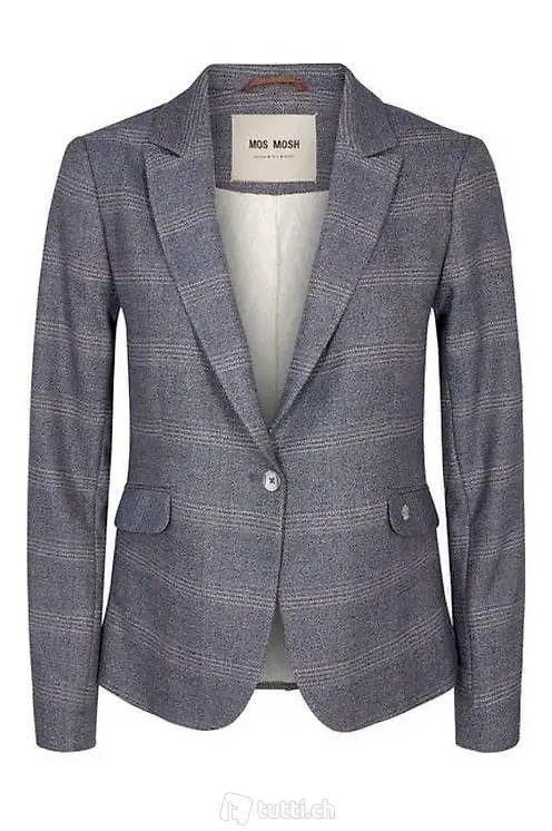 Blazer von Mos Mosh in elegantem Indigo Glencheck-Muster. Leicht auf Taille in der Linie wird der Blazer mit einem schönen, goldfarbigen Zierknopf auf Taille verschlossen und vier ebenfalls in gold gehaltene Knöpfe am Ärmelbund betonen die elegante Erscheinung. Der Blazer zeigt sich mit vorderen Pattentaschen und einer linksseitigen, goldfarbigen Mos Mosh Metallplakette. Formgebende Abnäher perfektionieren die Passform. Das Innenfutter an der Rückenpartie ist in filigran floreal gemustetertem