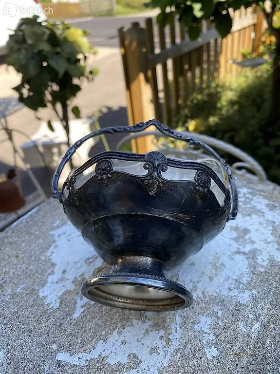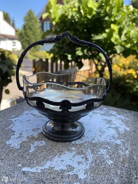 versilbertes Henkelkörbchen mit Glaseinsatz antik