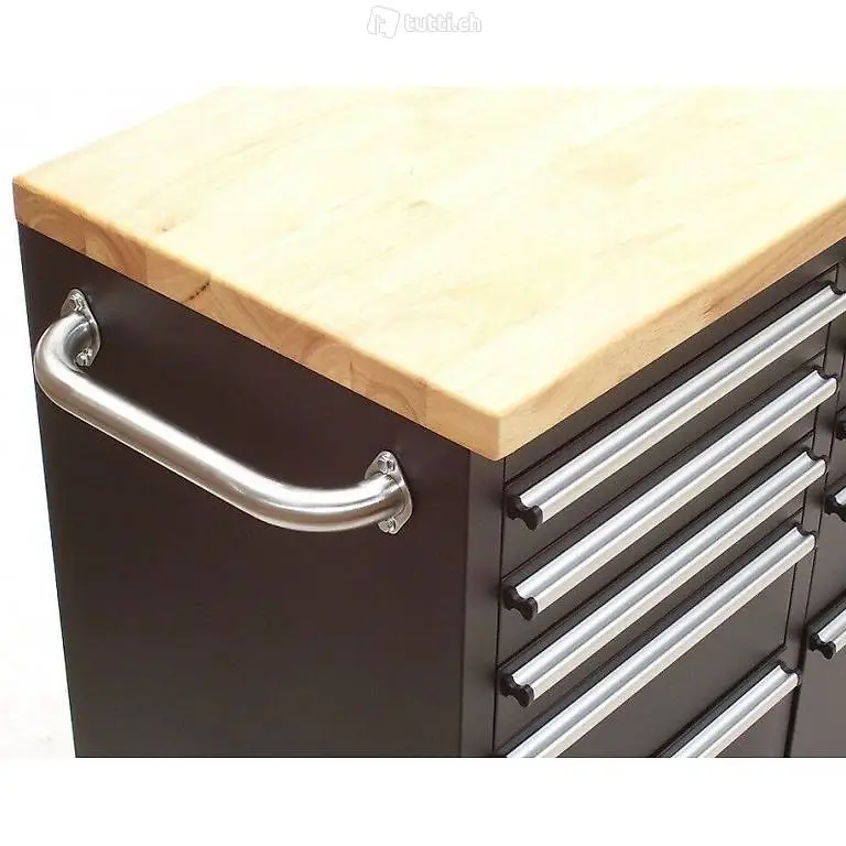 1 Stück, Profi- Werkzeugwagen mit 15 Schubladen und Massivholzarbeitsplatte