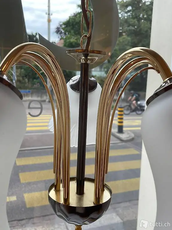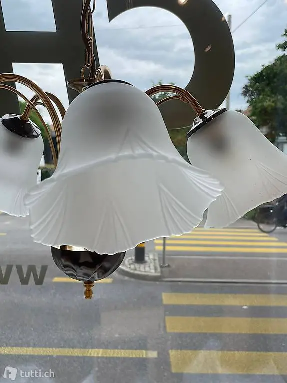 Deckenlampe mit fünf Blumen-Lampenschirmen mit filigranen Details. Die Schirme sind aus milchigem