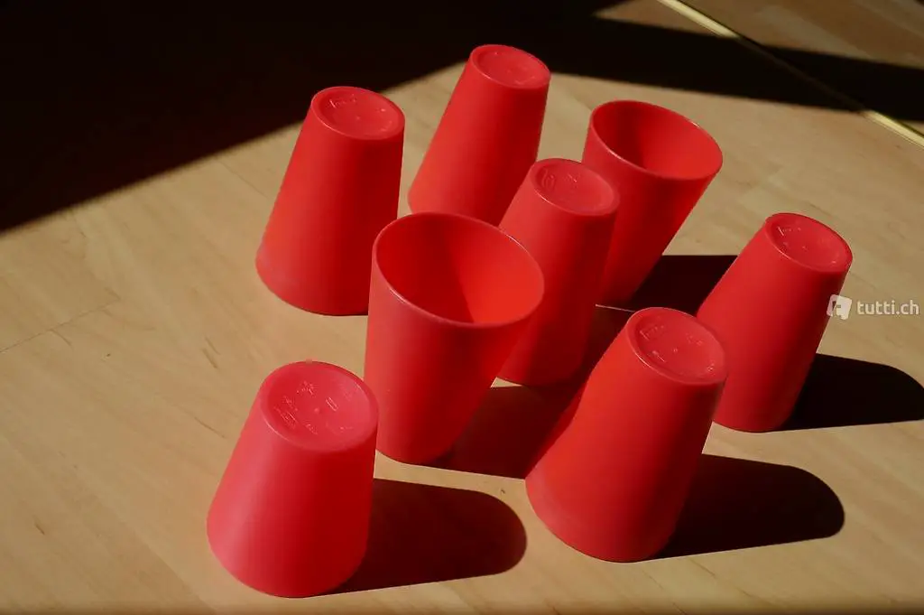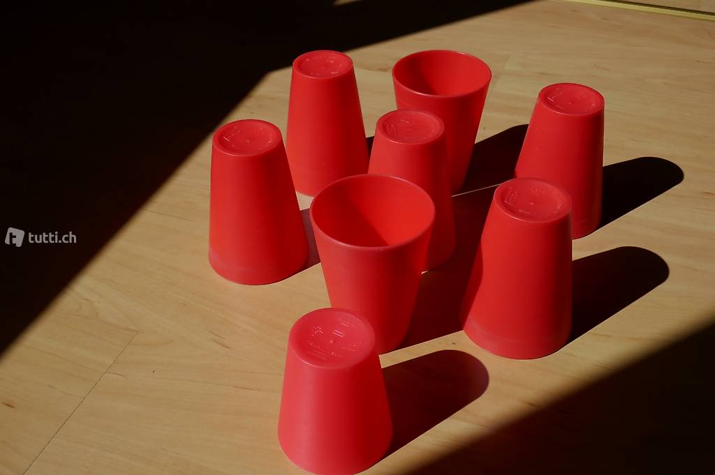 Hartplastik. Die Wanddicke beträgt 2 mm. Inhalt: 7x 3dl / 1 x 2 dl. Die Becher wurden wenig gebraucht.