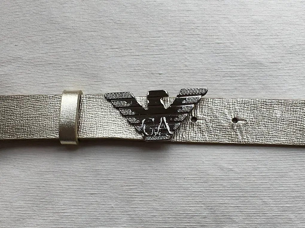 exclusiver EMPORIO ARMANI Gürtel, goldfarben, mit sehr schöner Logoschnalle (GA) , und Strasssteinchen, 5- fach verstellbar, 100% echtes Leder, Made in Italy, l 91cm, b 2,7cm, neuwertig, nicht getragen, top Zustand, mit EA- Staubbeutel,