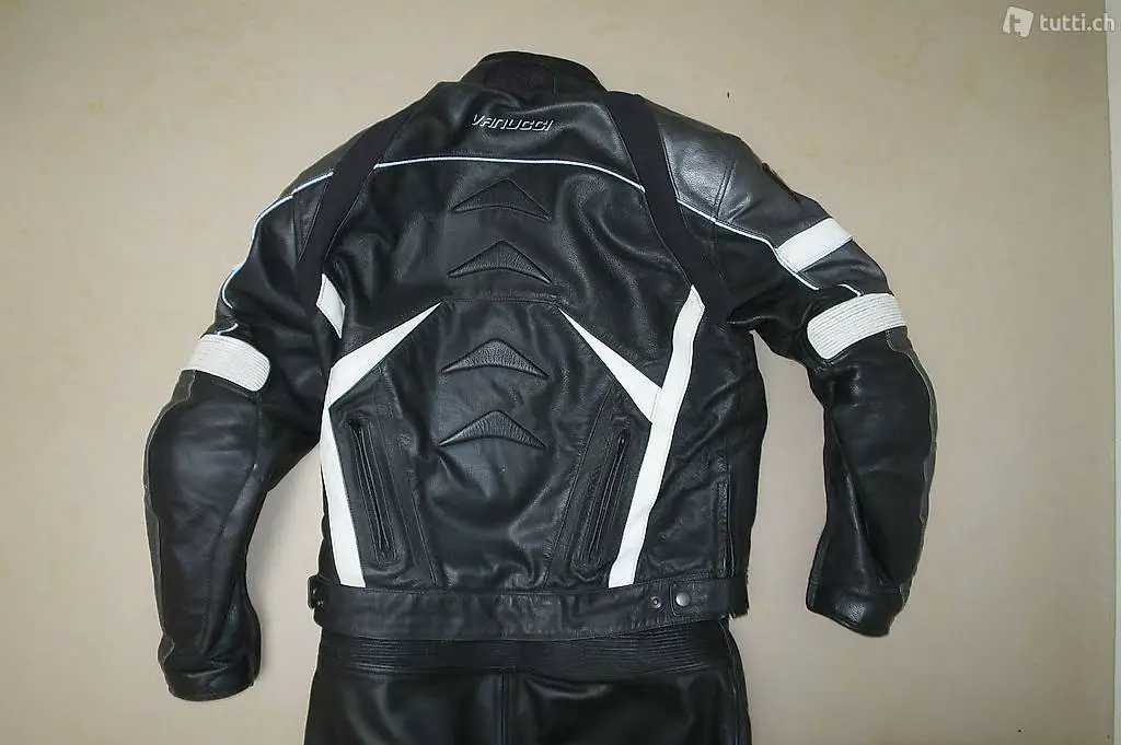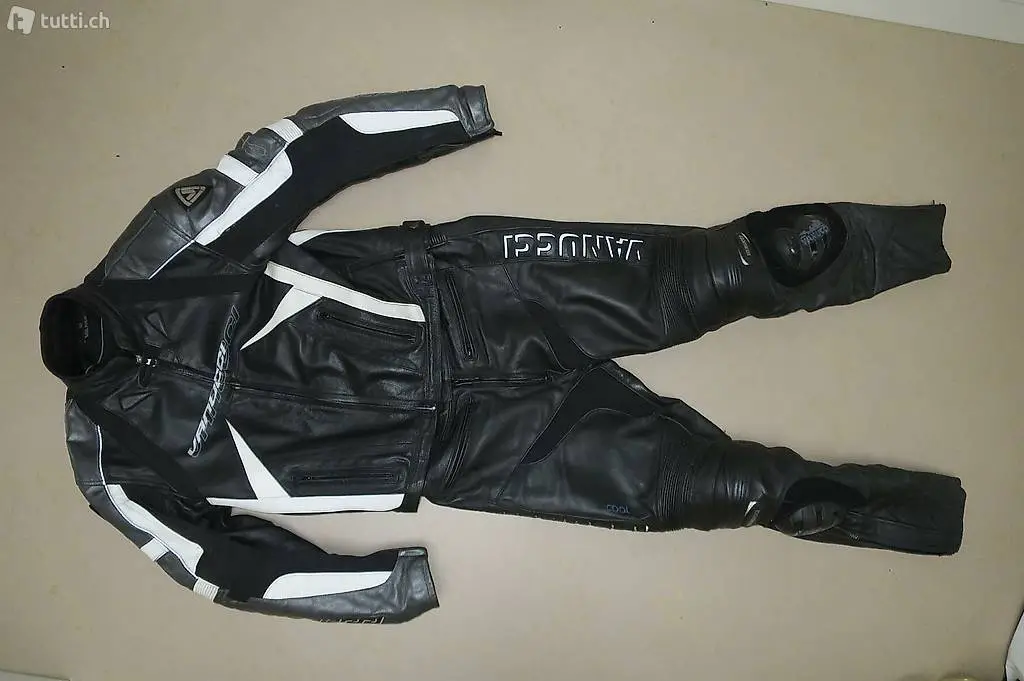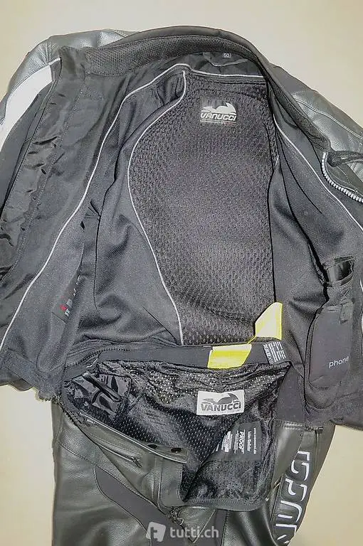 Jacke, diverse Aussen- und Innentaschen, diverse Belüftungsöffnungen (mit RV regulierbar) , Gurtschlaufen am Hosenbund, ungebrauchte und originale Knieschleifer usw.