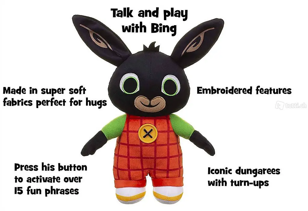 Talking Bing Soft Toy ist superweich und perfekt zum Kuscheln. Drücken Sie auf Bings Bauch, um viele seiner Lieblingsphrasen aus der Show zu hören.