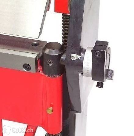 Dabei ist die Schwenkbiegemaschine mit einer Biegewinkeleinstellung mit Gradskala, Klemmanschlag (mit Inch-Skala) und Feineinstellung ausgestattet.