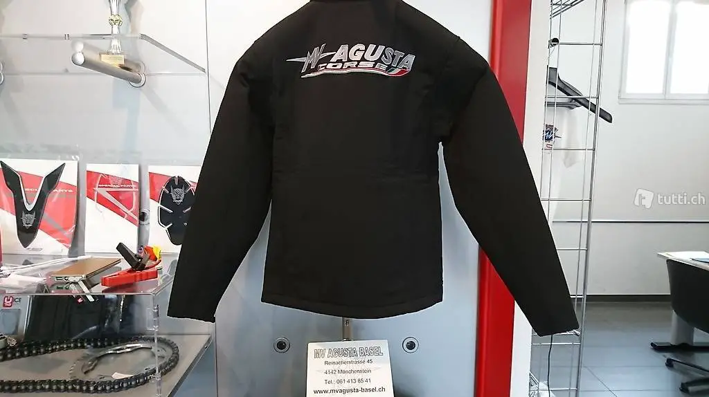 Zu verkaufen steht eine Softshelljacke von MV Agusta in schwarz in der Grösse S. Auf der linken Brust befindent sich das Emblem von MV Agusta, dieses wir von einem Italo-V eingerahmt und vom Schriftzug Corse unterstrichen. Die Reisverschlüsse der beiden Seitentaschen haben die italienische Flagge als Anhänger. Auf dem Rücken ist der Schriftzug MV Agusta Corse gross geschrieben. Diese Jacke ist original aus der MV Agusta Modelinie. Die Softshelljacke kostet jetzt neu 265.00 anstatt 295.00 CHF (Neupreis) exklusive Versandkosten.