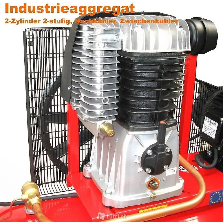 Hochwertiges riemengetriebenes 2-Zylinder Industrieaggregat mit Nach- und Zwischenkühler und gehärteten Kolbenringen und Edelstahlventilen, in professioneller 2 stufiger Bauweise für höchste Effizienz.