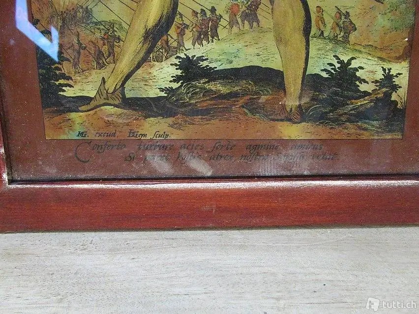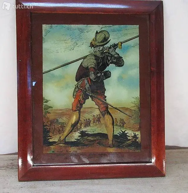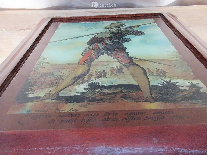 Seltenes Hinterglasmalerei mit einer Szene aus Renaissance Zeiten. Mit latainischen Text: Conferinta turbare acies sorte agmine amicas si paret hostis atrox nostra sarissa vetat... Masse 33 x 40 cm. Besichtigung und Abholung bei Flums Antik oder Lieferung / Versand 21 Franken.