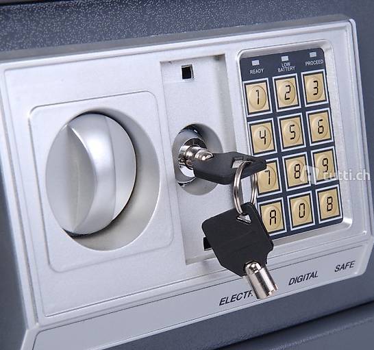 Mit elektronischem Zahlenschloss, welches die Öffnung nur durch Eingabe eines Codes oder mit einem Notfall-Sicherheitsschlüssel ermöglicht