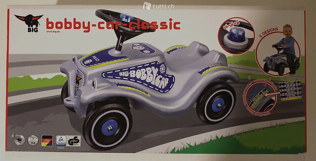 Ein griffiges Lenkrad, vier stabile Räder, je eine Anhängerkupplung vorne und hinten sowie eine Kniemulde zum Fahren für grössere Kinder ergänzen die spielstarke Ausstattung. Für einen kleinen Wendekreis sorgt die stufenlose Achsschenkellenkung des Big-Bobby-Car. Die hervorragende Verarbeitungsqualität und der tiefliegende Schwerpunkt machen das Big-Bobby-Car zum besonders sicheren Spielzeug.