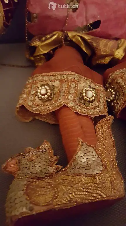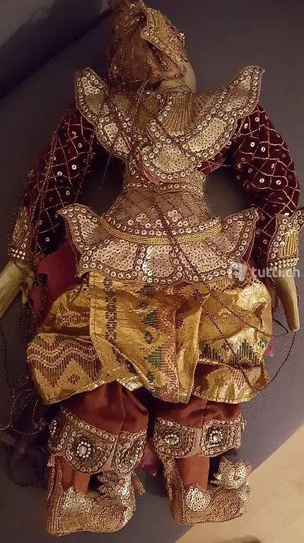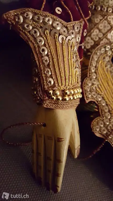 Die Marionette ist ca. 53 cm gross (ohne Schnüre) . Die Kleidung der Puppe ist mit schönen Pailletten und Perlen bestickt sowie Steinen bestückt.