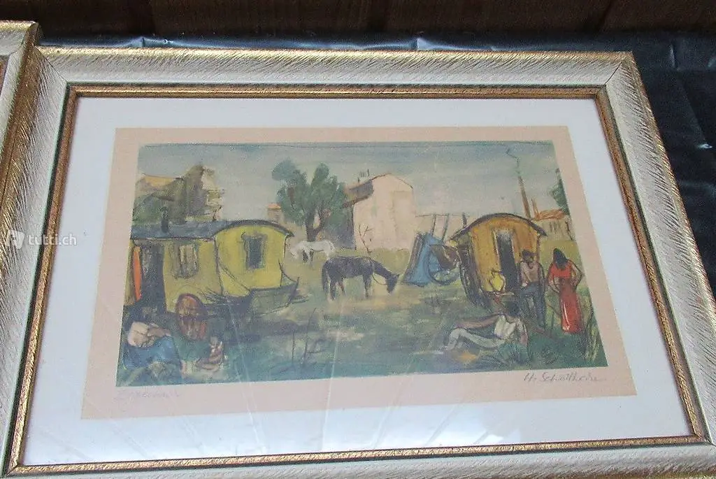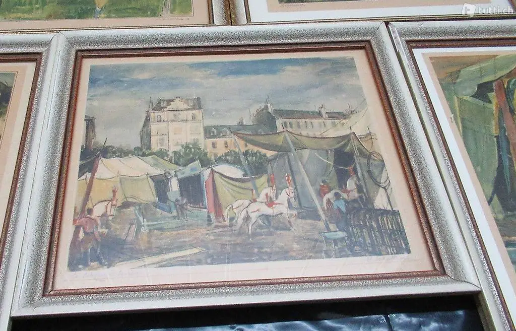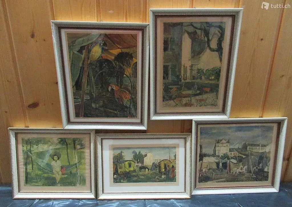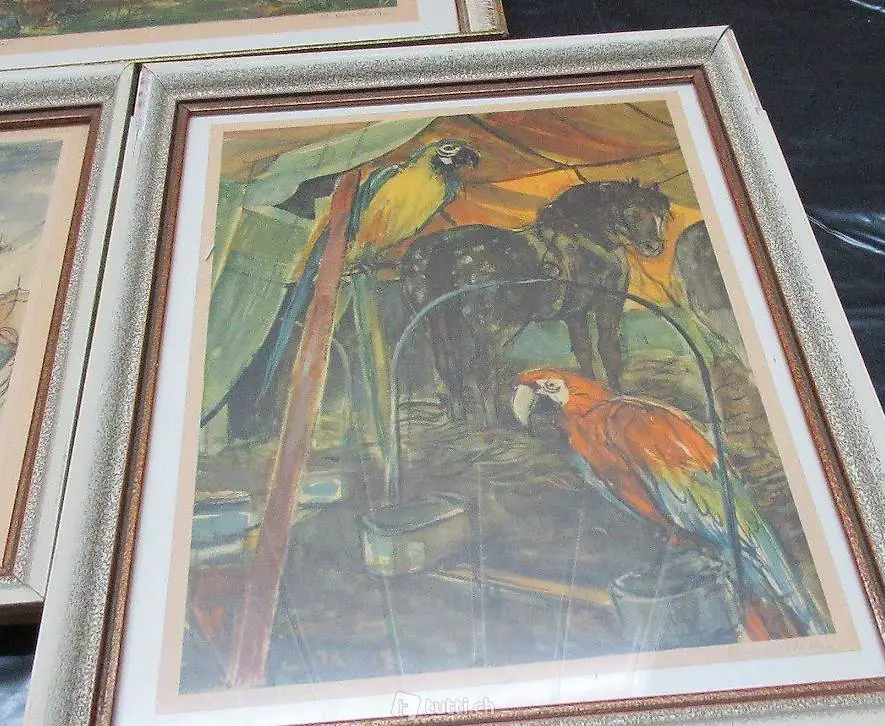 5 handsignierte Lithografien des schweizerischen Malers Hans Schoellhorn (1892 - 1982) . Der Vorbesitzer war Pressesprecher des Zirkus Knies in den 1950 ziger Jahre und erhielt diese Bilder als Abschieds-Geschenk.Sehr schönes und dekoratives Format. Pagagaien (24 x 29 cm) , Tischgruppe (23 x 29 cm) , Mädchen auf Hängematte 24 x 21 cm) . Genf (27 x 24 cm) und Zigeuner 28 x 20 cm. Verkauf nur im Konvolut, kein Einzelverkauf. Besichtigung und Abholung bei Flums Antik oder Lieferung / Versand 11 Franken.