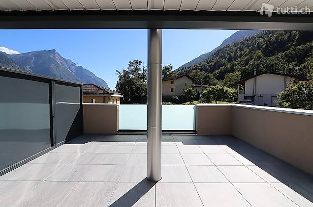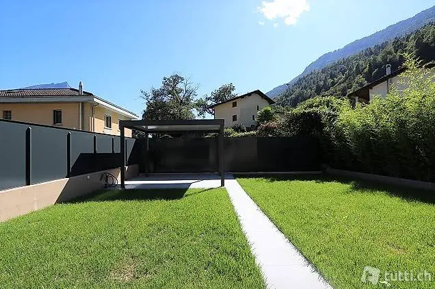 Im Erdgeschoss führt der Eingang mit Dusche/WC in den offenen Wohn-/Essbereich mit moderner Küche und markantem, drehbarem Cheminée. Davor lässt es sich auf dem grosszügigen Aussenbereich mit Sitzplatz, Pergola und pflegeleichtem Garten wunderbar entspannen. Dabei geniesst man Privatsphäre und einen herrlichen Ausblick auf die umliegenden Berge.